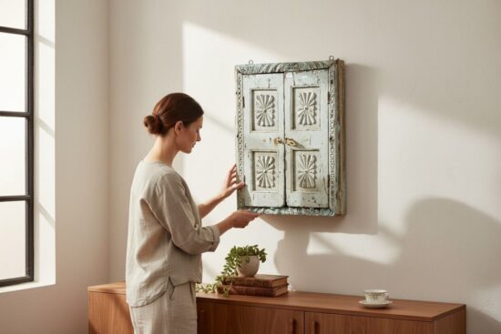 Once part of a traditional Indian haveli (mansion), this antique window tells stories of heritage and craftsmanship that have endured for generations. Its distressed finish, gentle wear, and soft pastel tones add authentic rustic charm — making it a standout decor accent whether used as a wall panel, mirror frame, or architectural art piece.