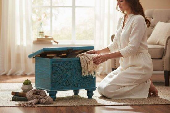 Perfect as a storage trunk, blanket box, entryway statement piece, or boho home décor accent, it brings both function and style to living rooms, bedrooms, hallways, or studio spaces. The solid build and carved front make it a standout décor element for homes with farmhouse, coastal, bohemian, or eclectic themes.