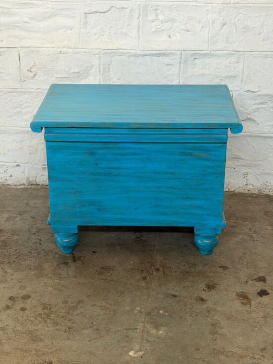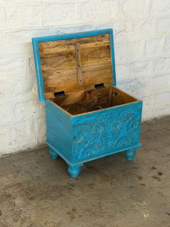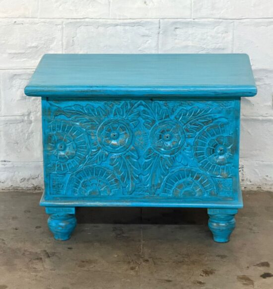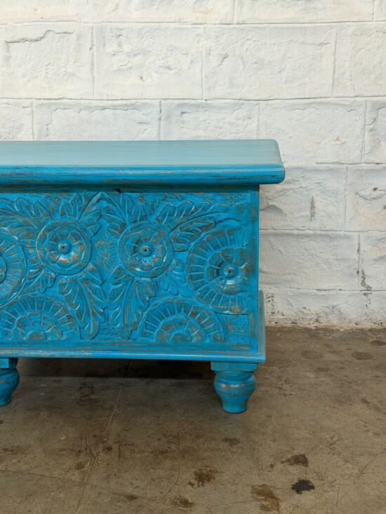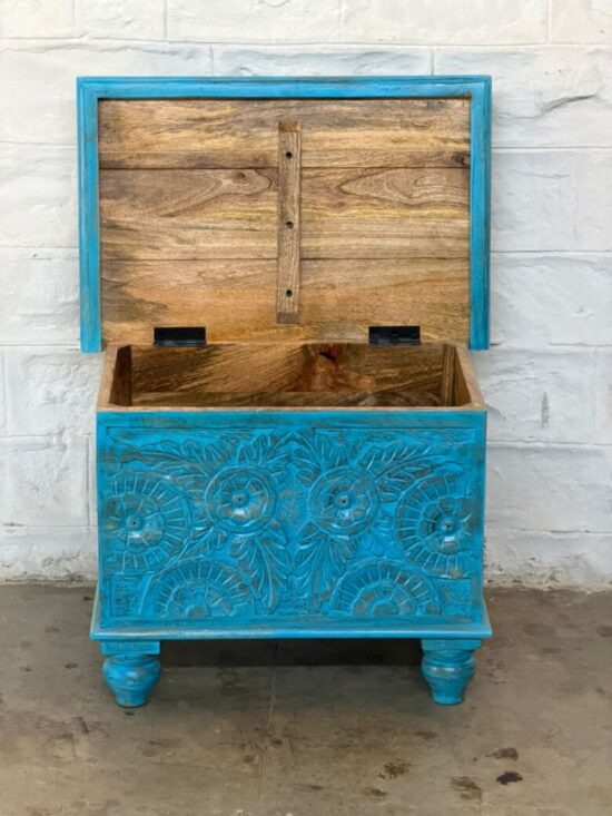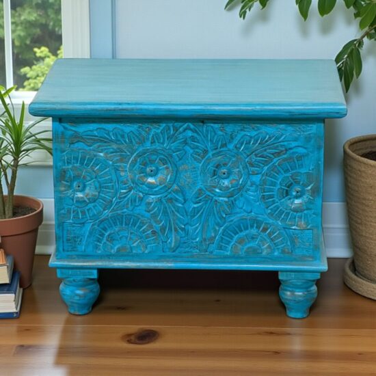 Hand carved Wooden Chest – Distressed Turquoise Finish – 24 x 16 x 18 Inches