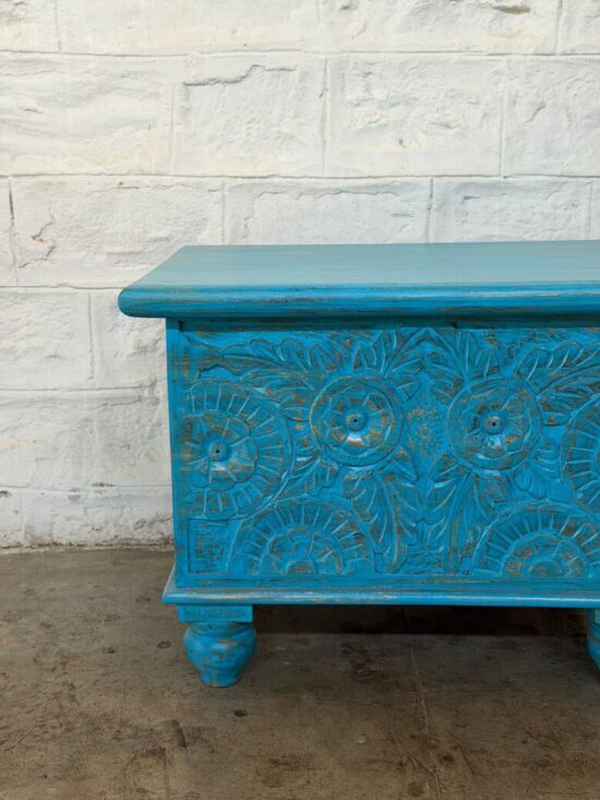 This beautifully crafted wooden chest features deep handcarved floral detailing on the front and a rich distressed turquoise finish that adds a bold, artistic touch to any room. Newly made but designed with an aged, rustic appearance, this piece blends modern craftsmanship with vintage-inspired charm.