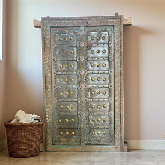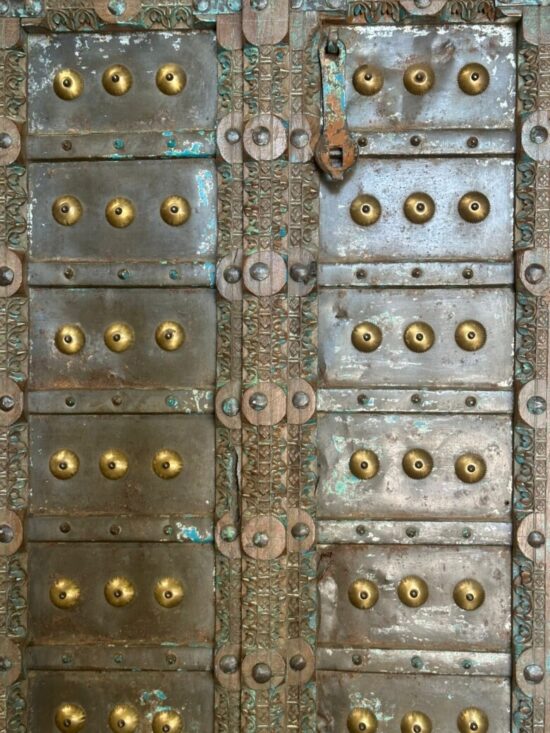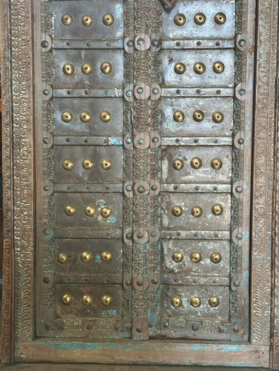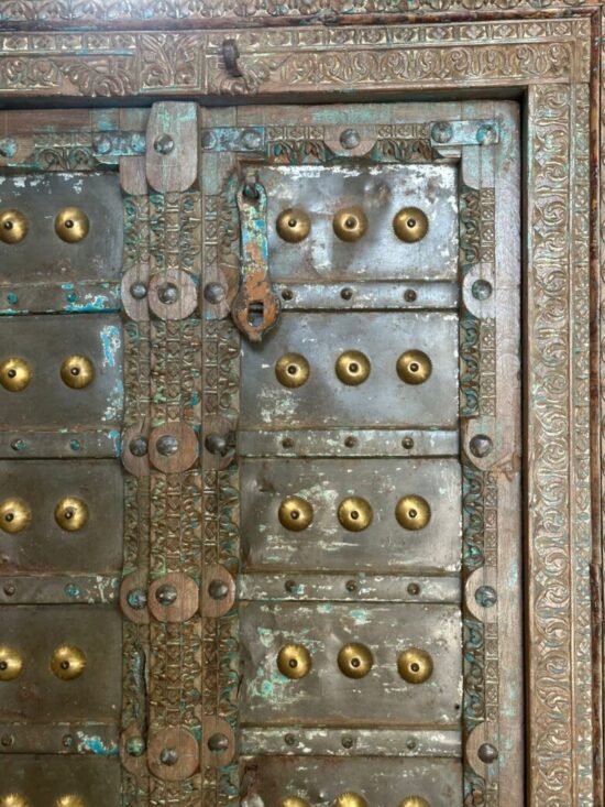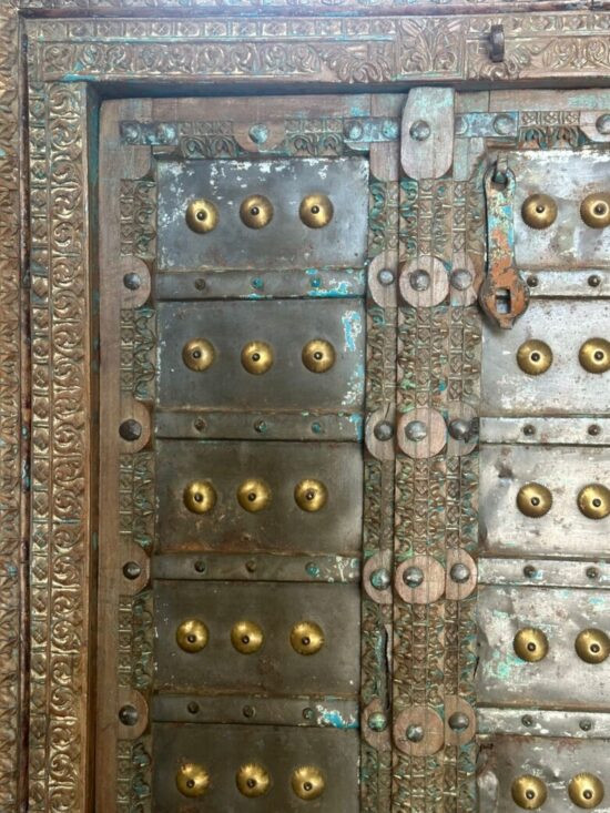 Each piece is intricately carved by skilled artisans, with a frame that showcases traditional Indian motifs and textured patterns that have weathered over time to create a stunning natural patina. The window doors are adorned with eight brass medallions, reminiscent of ancient temple or haveli doors, and the solid central wooden bar evokes a sense of strength and tradition.