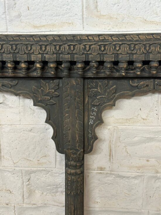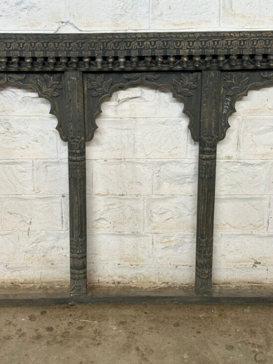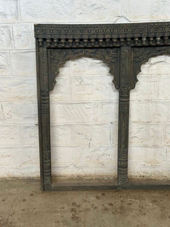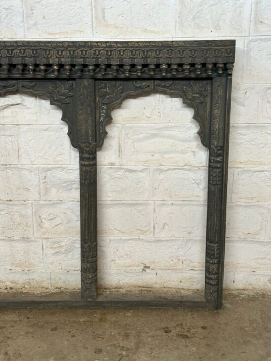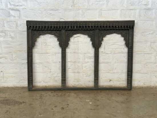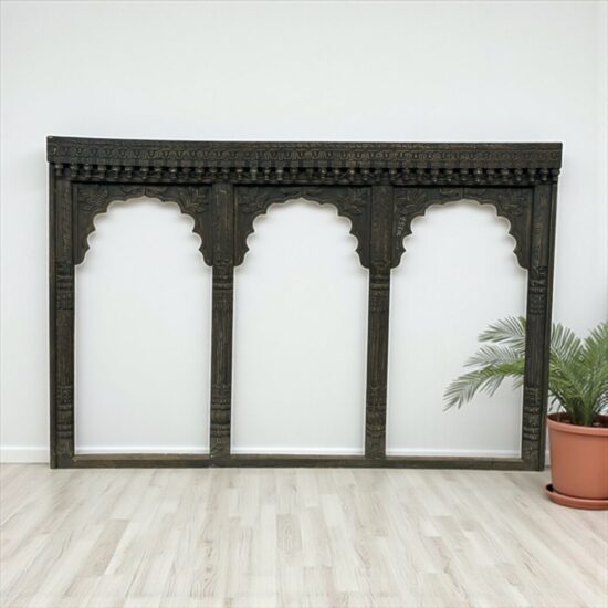 Bring home a piece of timeless Indian craftsmanship with this Vintage Jharokha Triple Arch Mirror Frame. Hand-carved in solid wood, this antique frame features three elegant arches with intricate floral and lattice-inspired carvings.