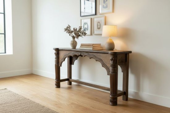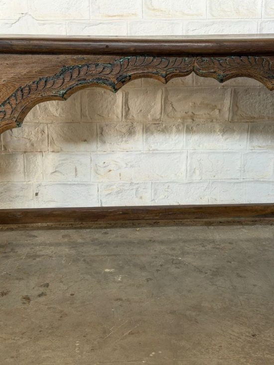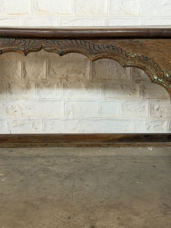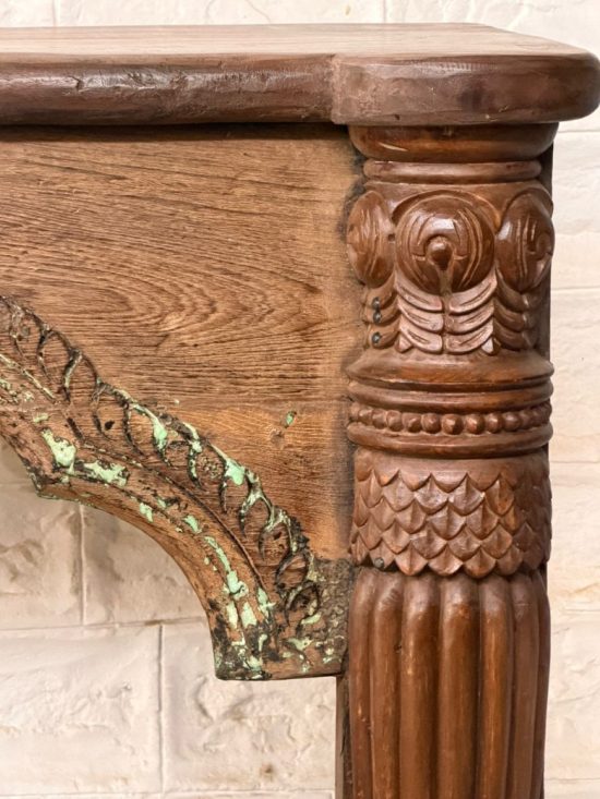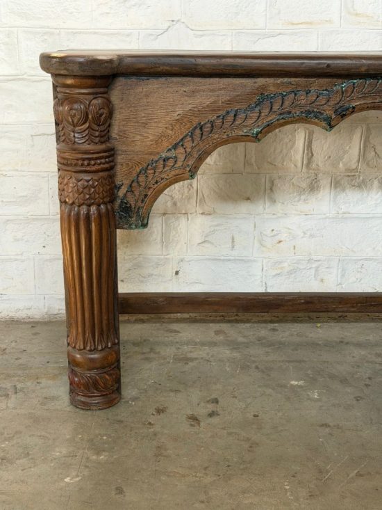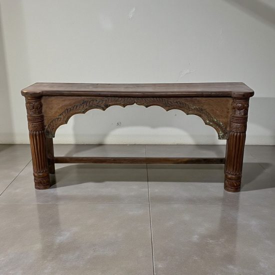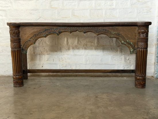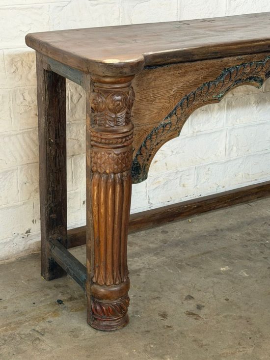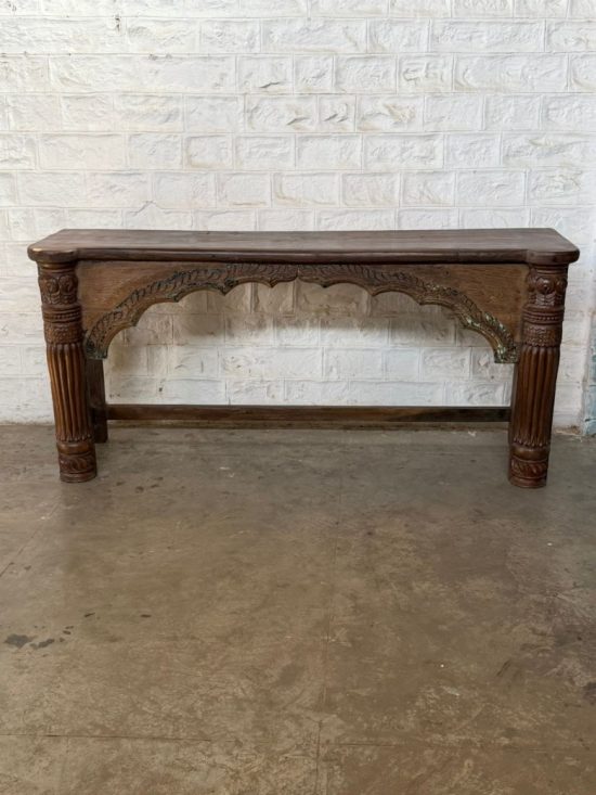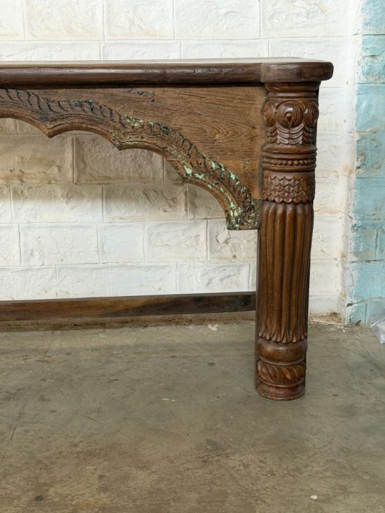 A beautiful 100-year-old antique Indian console table crafted from solid teak wood, featuring elegant hand-carved arch detailing and sculptural turned legs. This timeless piece reflects the craftsmanship of traditional Indian furniture makers and carries the warmth and character that only a century-old piece can offer.