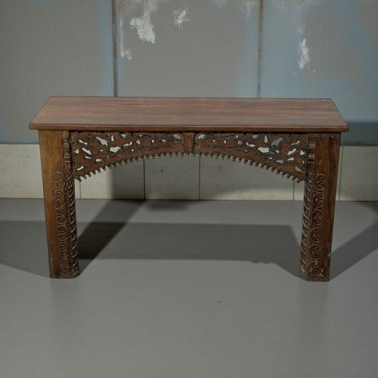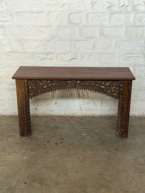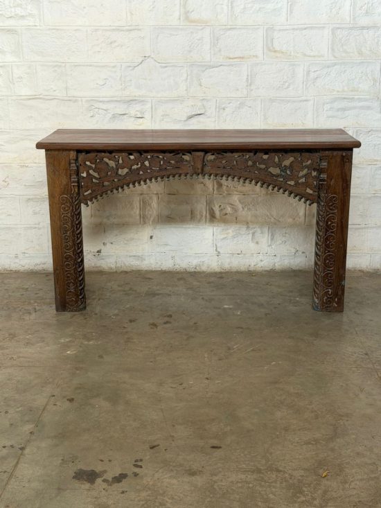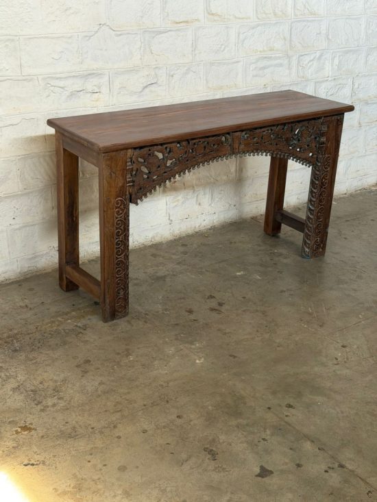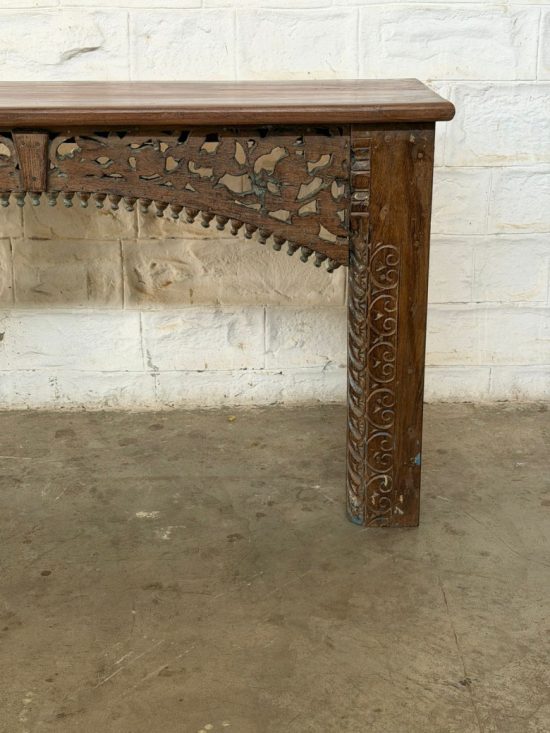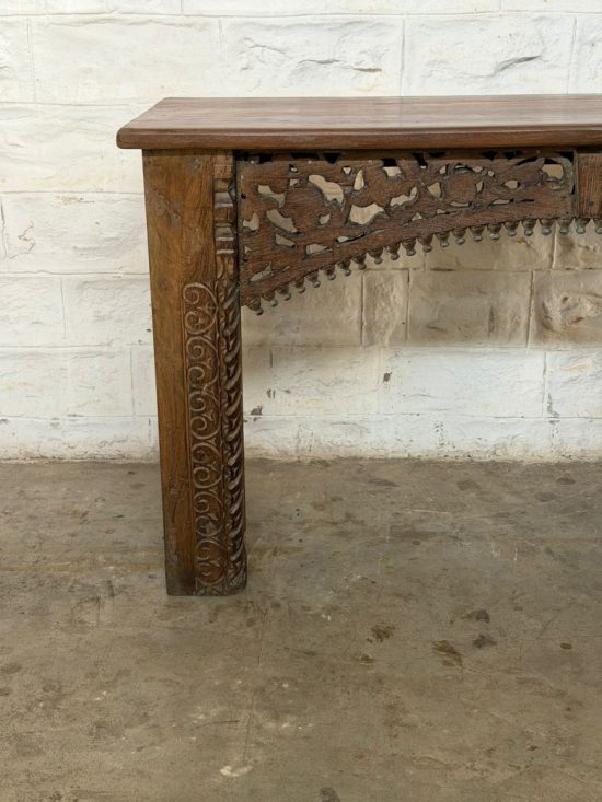 A striking mid-century Indian console table handcrafted from solid teak wood. Featuring intricate hand-carved detailing on the legs and side brackets, this piece reflects traditional Indian craftsmanship from the 1930s.