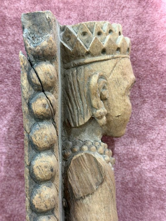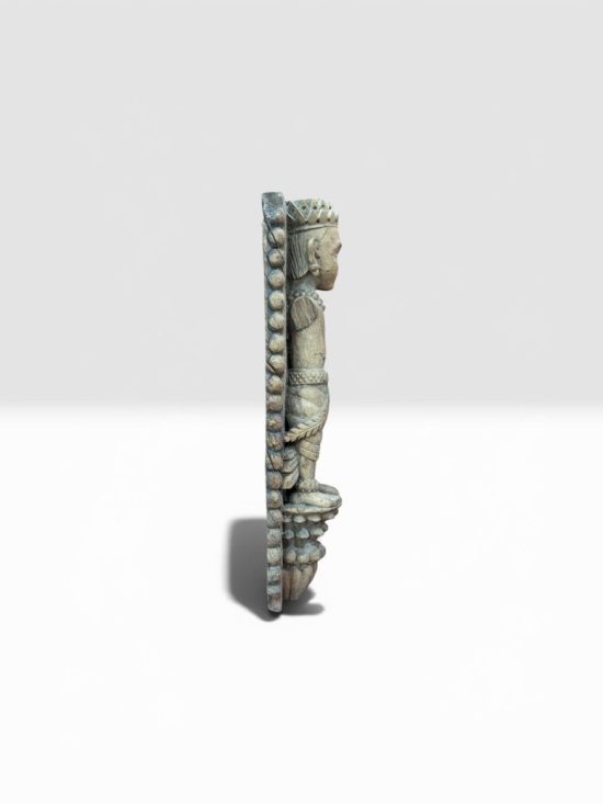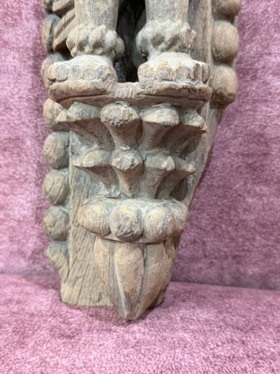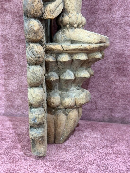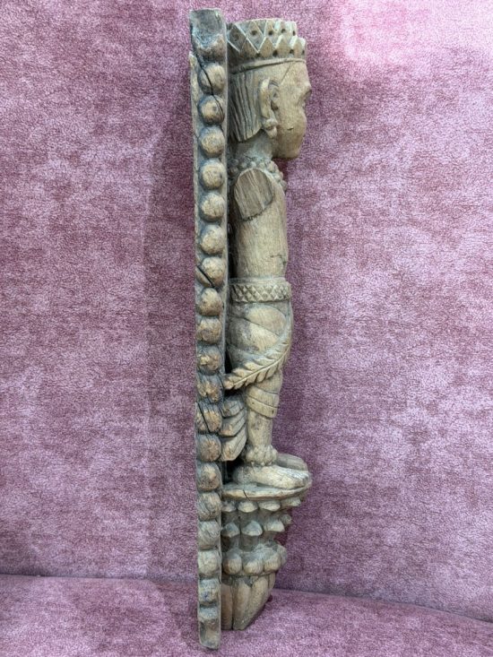 A rare 300-year-old hand-carved teak wood sculpture, likely originating from an architectural or temple element, featuring a stylized deity or guardian figure.
