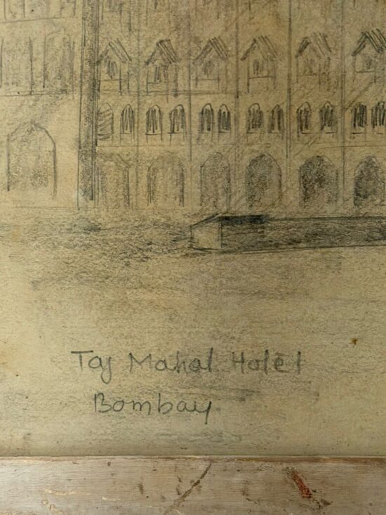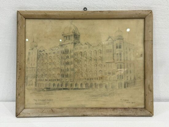 A rare early 20th-century vintage pencil sketch depicting the iconic Taj Mahal Hotel, Bombay (now Mumbai), rendered with fine architectural detailing and historic perspective.