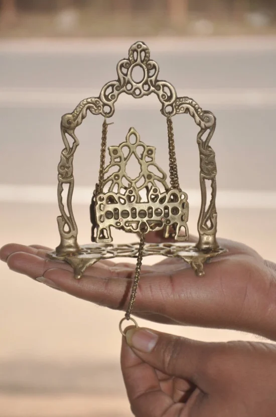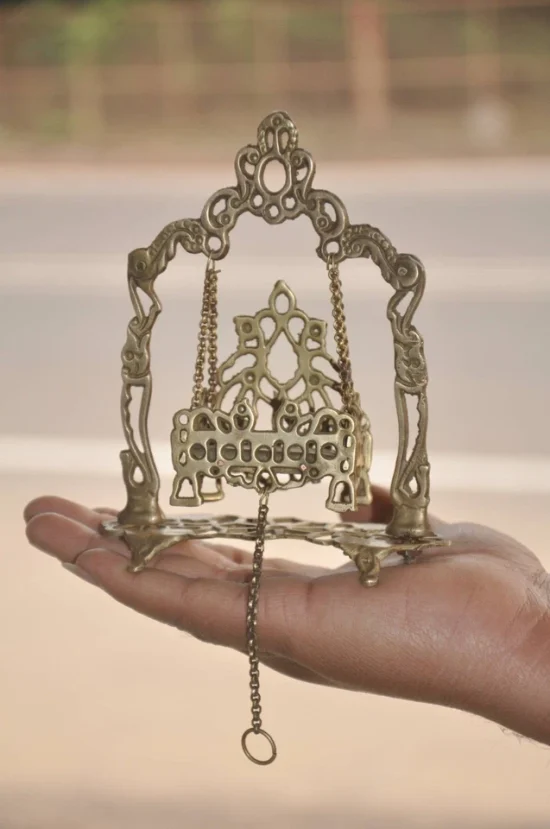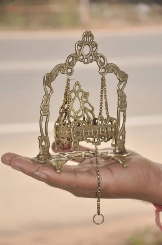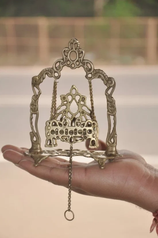 In Hindu tradition, swings like this are used during Krishna Janmashtami celebrations and for daily temple décor, symbolizing devotion and divine childhood of Lord Krishna.