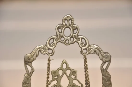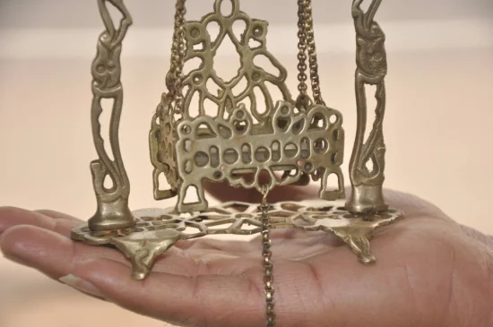 A beautiful vintage handcrafted brass Baby Krishna swing (Jhula) featuring delicate jali cut openwork and traditional Indian craftsmanship, dating back approximately 60–70 years.