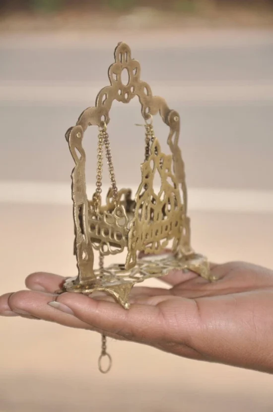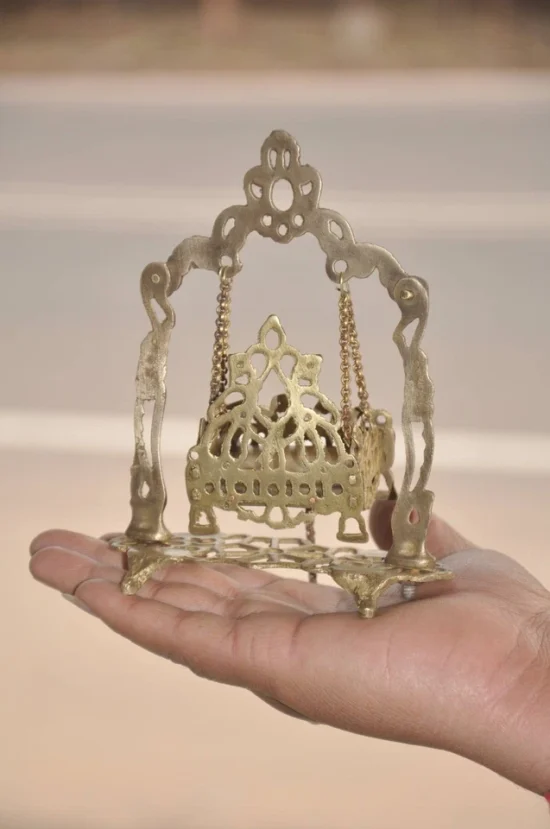 This charming devotional piece depicts Baby Krishna seated in a miniature swing, suspended with brass chains inside an ornate handcrafted frame. The entire structure is decorated with intricate jali cut work, showcasing the remarkable skill of traditional Indian artisans.