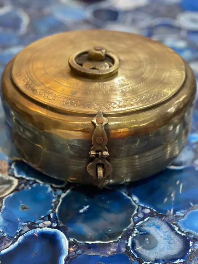 This antique brass round chapati bread box adds a delightful decor to your home and has a solid latch that a padlock could be added, to lock it. The lid flips back completely flat when open. Can also be used for storing jewelry & keepsakes.