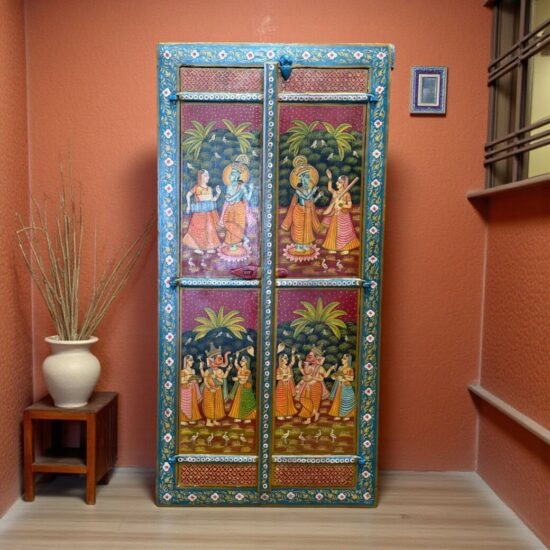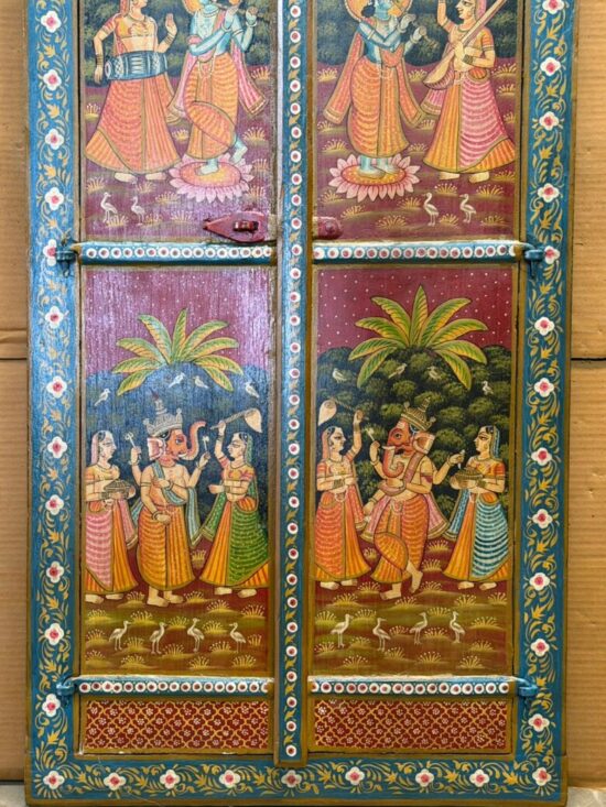 Hand painted windows like this were integral to traditional Indian homes, combining ventilation with storytelling art. Krishna-themed panels hold devotional significance and are often associated with prosperity, love, and divine protection in Vastu and spiritual design traditions.