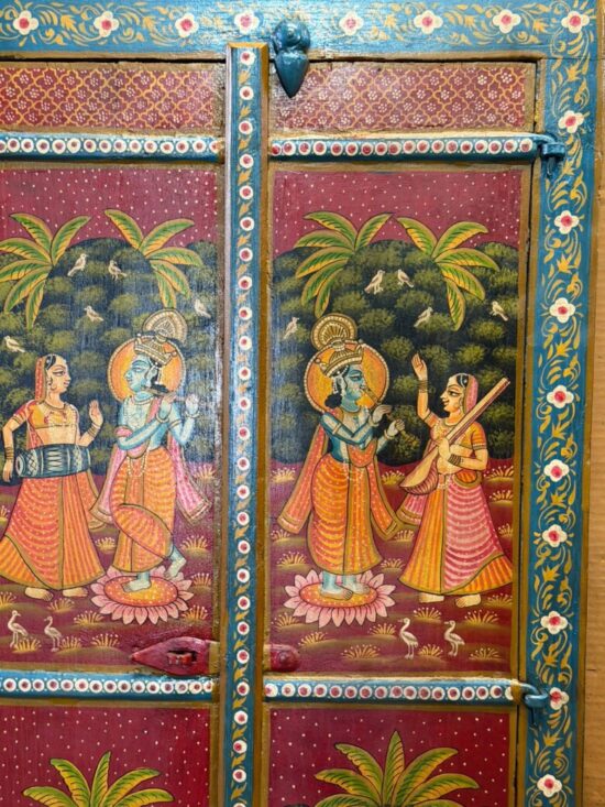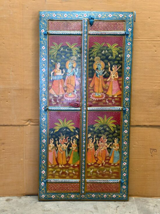 A rare antique wooden window panel featuring exquisite hand painting inspired by traditional Indian Pichwai and temple art styles. This heritage piece showcases divine scenes of Lord Krishna with attendants set amidst lush landscapes, executed in vibrant natural pigments and fine detailing.