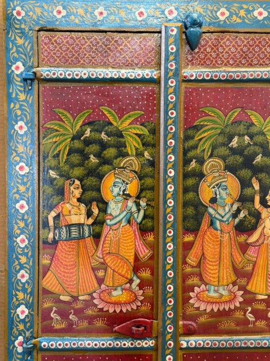 The richly painted borders, floral motifs, and narrative figurative panels reflect the craftsmanship of regional artisans and the storytelling tradition of Indian sacred art.