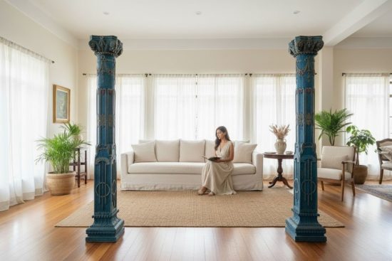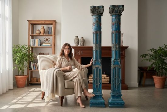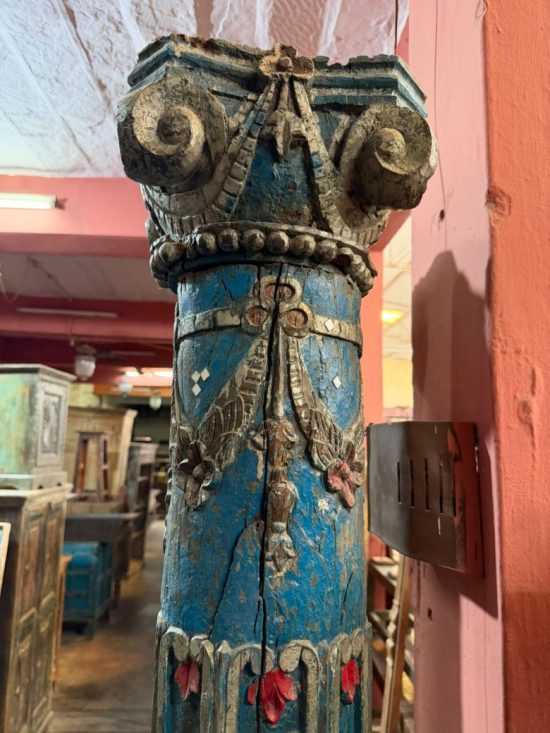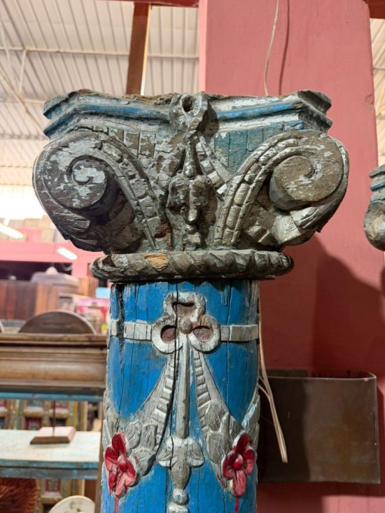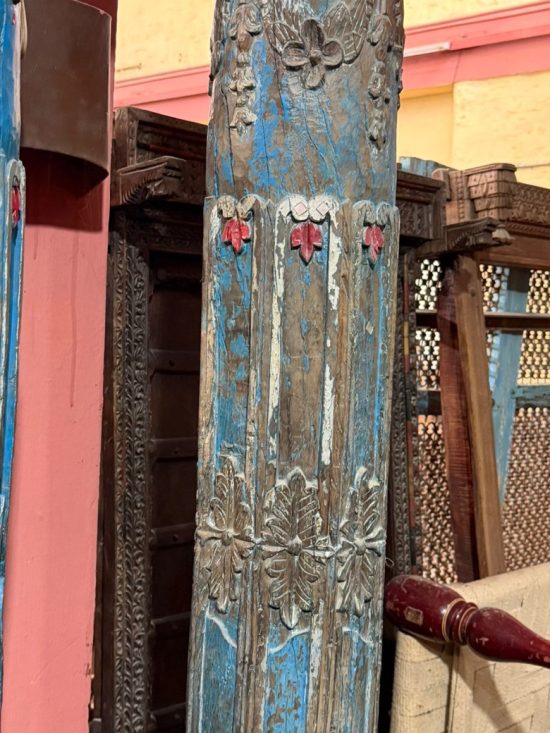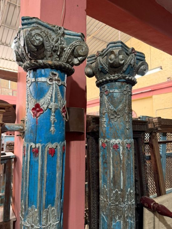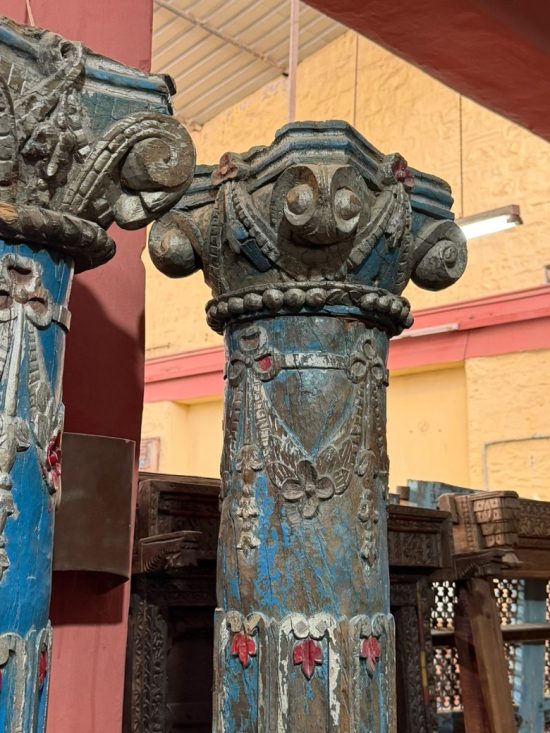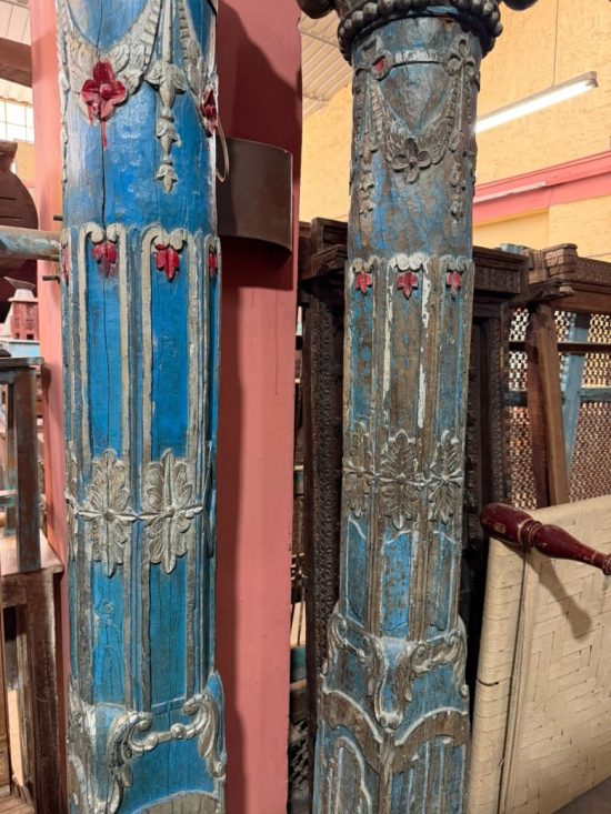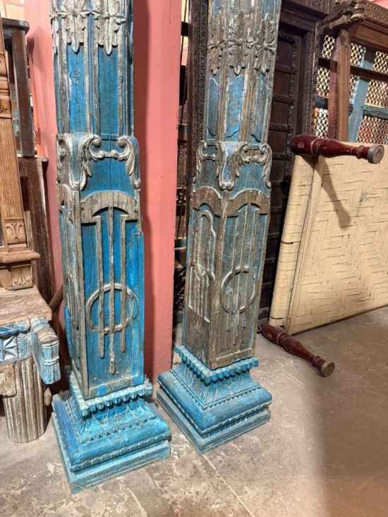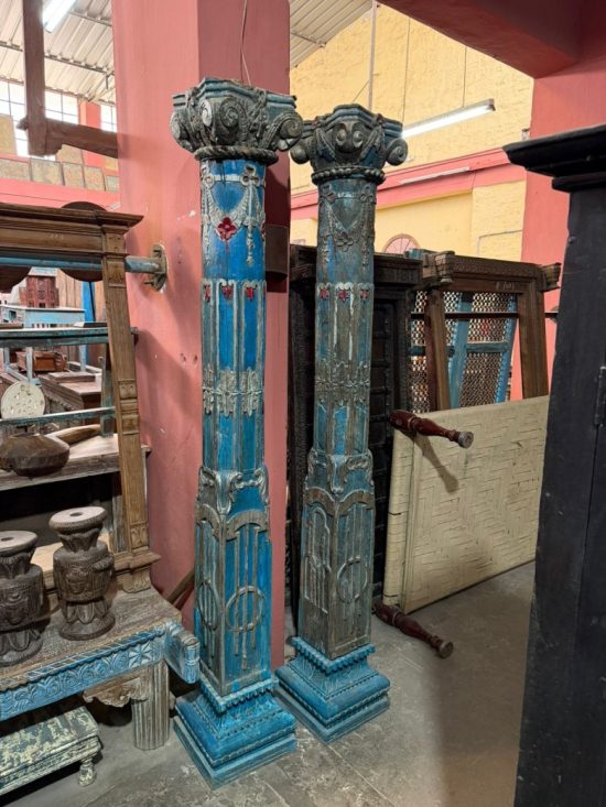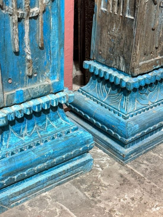 Each pillar features beautifully carved vertical panels, ornate capitals, and decorative motifs, reflecting the artistry of traditional Indian architectural craftsmanship. The weathered blue finish combined with the aged teak wood gives the pillars an extraordinary historic character and visual depth.