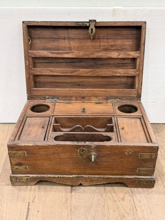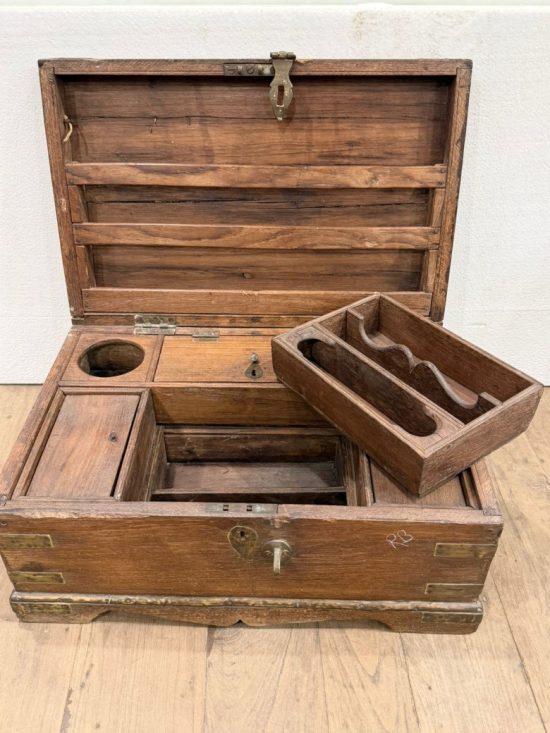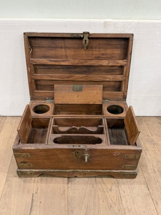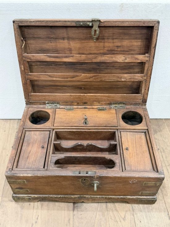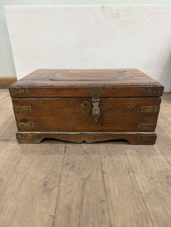 Crafted over 100 years ago from solid teak wood, this box reflects an era when craftsmanship met functionality. The interior reveals multiple hand-built compartments and hidden sections, designed for organized storage of coins, notes, and important records.