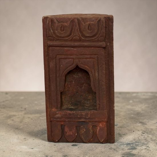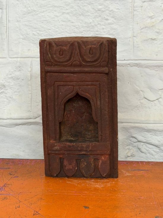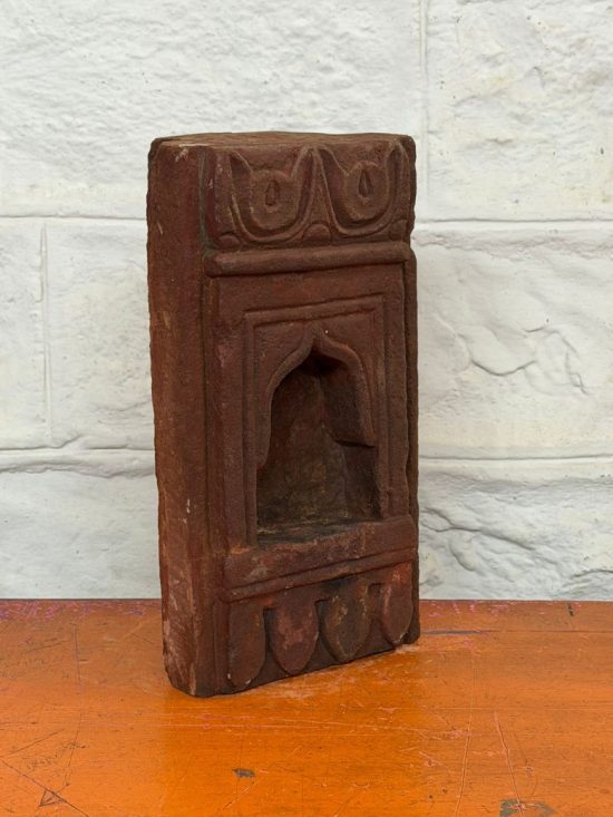 This antique Indian stone temple niche (Aala) is hand-carved from solid stone and dates back over a century. Traditionally built into temple or home walls, these niches were used to hold diyas, idols, or sacred objects. Today it makes a beautiful architectural salvage piece for meditation rooms, pooja spaces, or garden shrines.