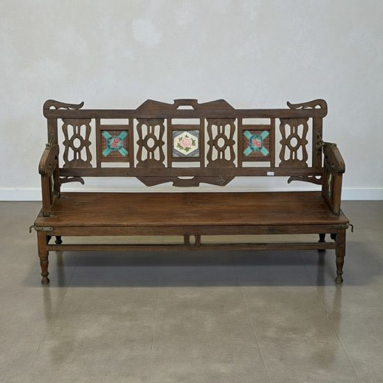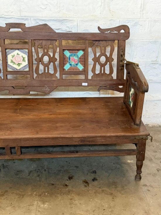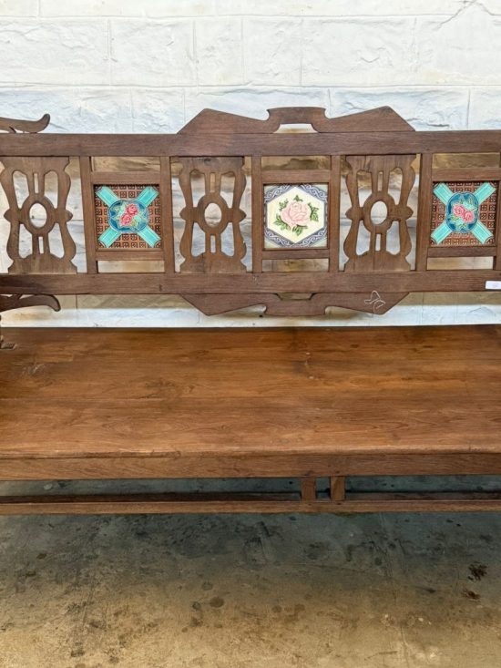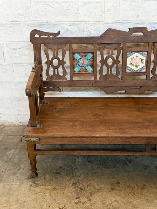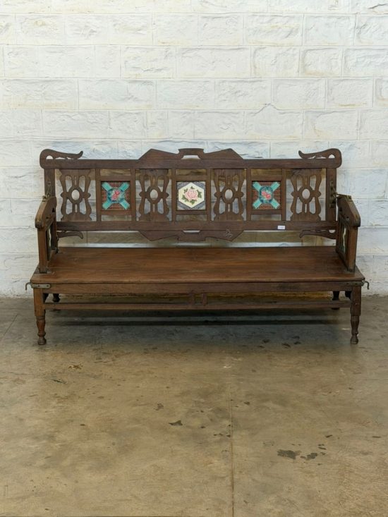 The beautifully carved teak frame features decorative cut-work panels and hand-painted floral tile inlays, adding color, character, and heritage charm. Every surface carries the warmth, patina, and authenticity that only true antique teak develops over decades.
