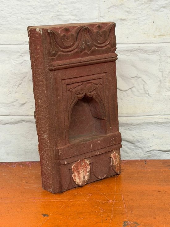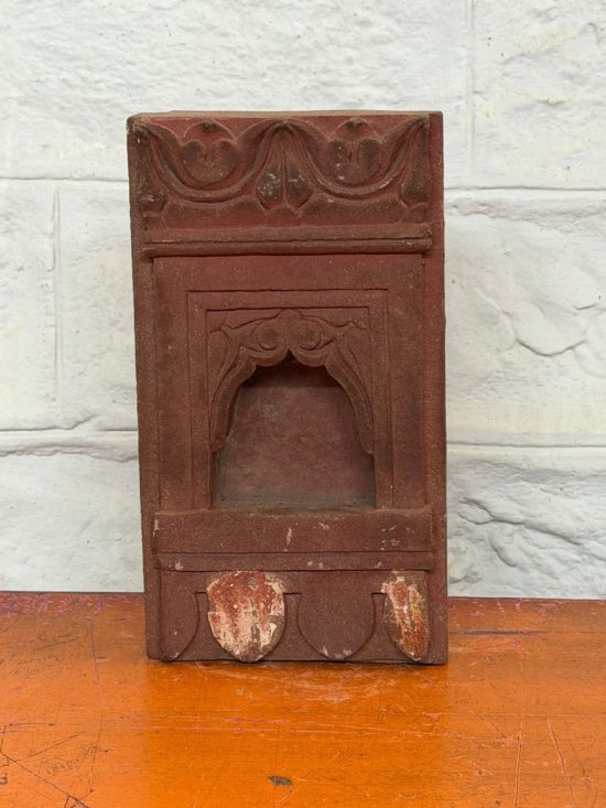 This antique Indian stone temple niche (Aala) is hand-carved from solid stone and dates back over a century. Traditionally built into temple or home walls, these niches were used to hold diyas, idols, or sacred objects. Today it makes a beautiful architectural salvage piece for meditation rooms, pooja spaces, or garden shrines.