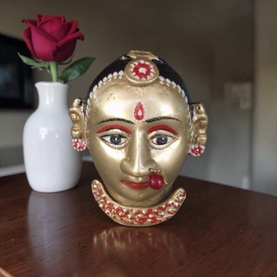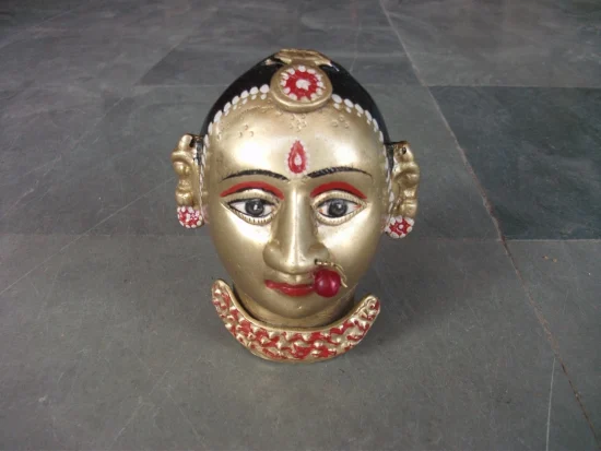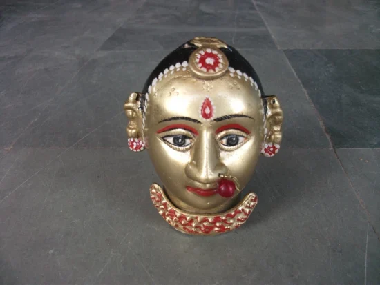 A striking vintage handcrafted brass bust depicting a traditional tribal woman, beautifully hand painted with intricate facial detailing and vibrant accents. The sculpture reflects the charm of Indian folk artistry, featuring expressive eyes, traditional jewelry, and decorative markings typical of regional tribal representations.
