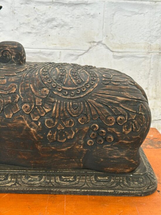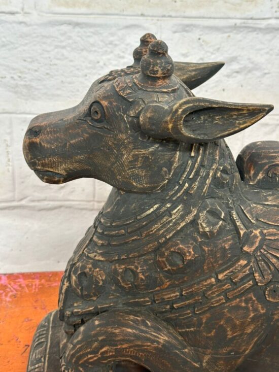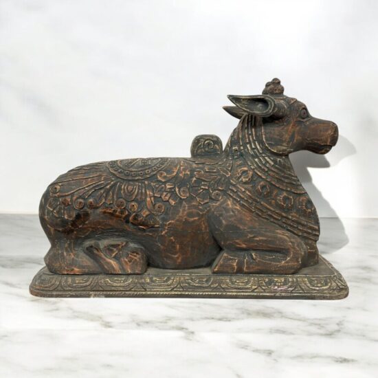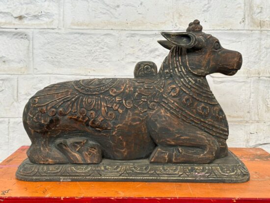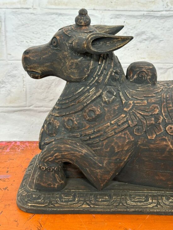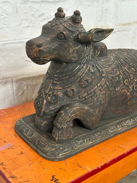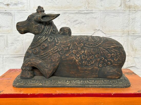 Bring home a rare and sacred piece of Indian heritage with this 100+ year old Nandi statue, hand carved from solid teakwood. A revered symbol in Hinduism, Nandi the Bull is the devoted mount of Lord Shiva and represents strength, faith, and loyalty.