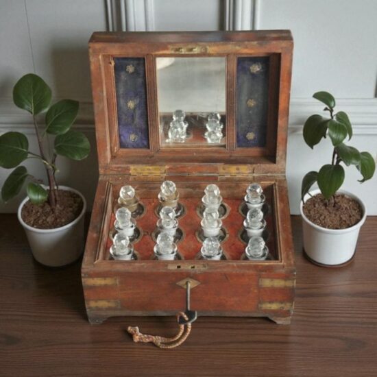 Rare Antique Wooden Perfume Chest with 12 Perfume Bottles & Mirror – Collector’s Vanity or Apothecary Box
