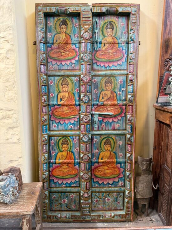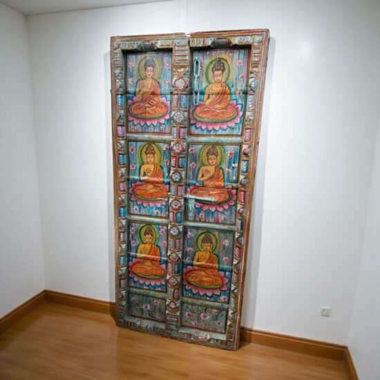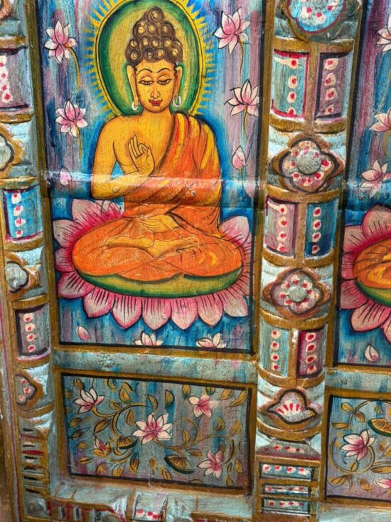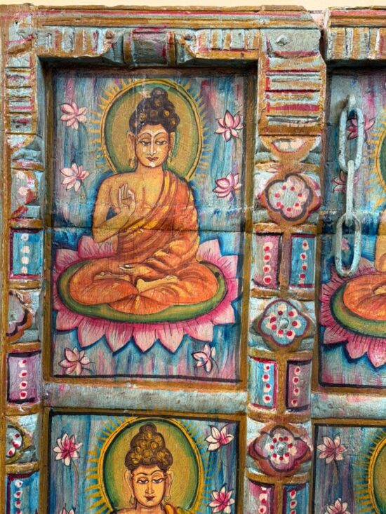 Each panel is meticulously hand-painted in Mughal floral motifs, featuring rich tones of blue, red, and gold that highlight its architectural charm. The natural distressed patina tells the story of its age and adds to its authenticity, making it far more than just a decorative piece—it is a slice of Indian heritage.