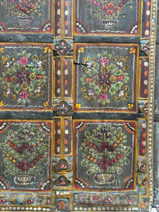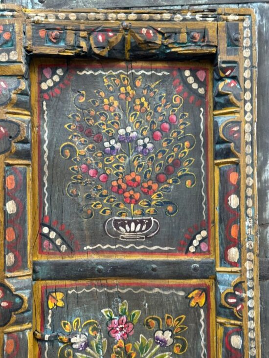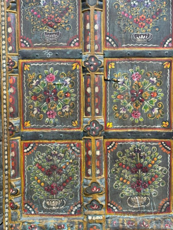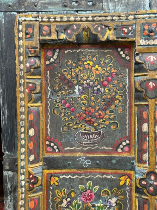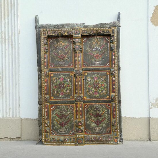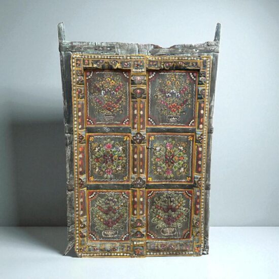 Dating back nearly 90 years, this antique window panel was once part of a traditional Indian home and still carries the timeless artistry and craftsmanship of its era. The detailed floral hand paintings, framed within carved sections, make it a striking wall décor piece for modern and traditional interiors alike.