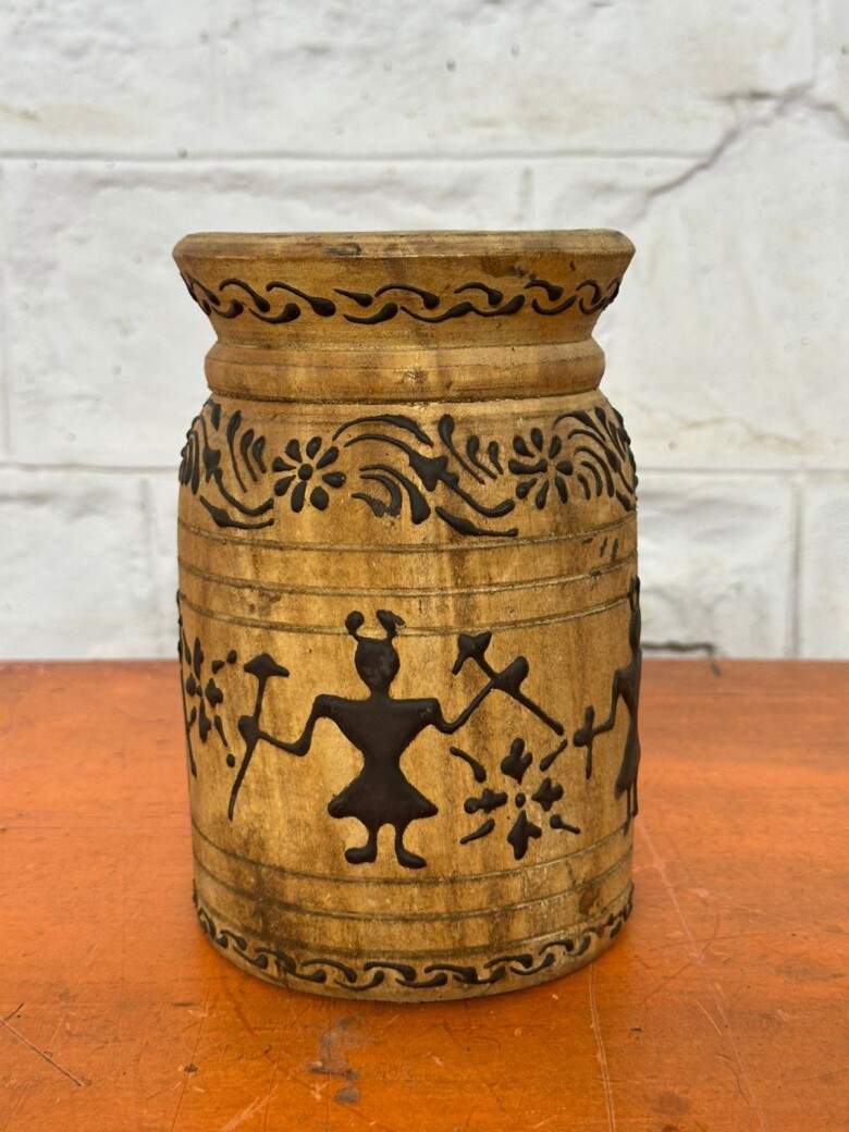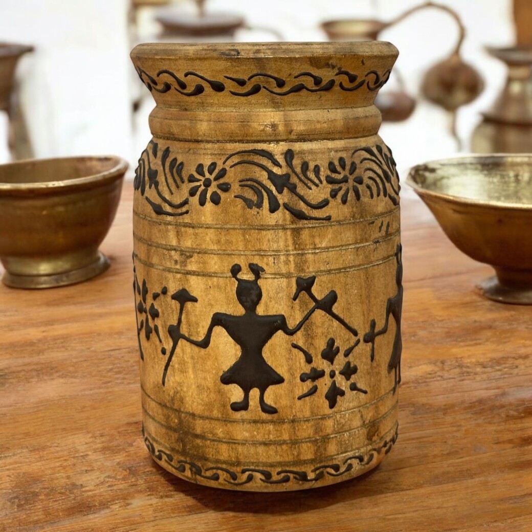 Step into the charm of India’s tribal artistry with this 90-year-old vintage teak wood pot, a true testament to timeless craftsmanship and culture. Measuring 15 x 15 x 15 cm, this hand-carved vessel showcases Warli-inspired tribal figures, dancing gracefully around the pot—bringing movement, story, and tradition to life.