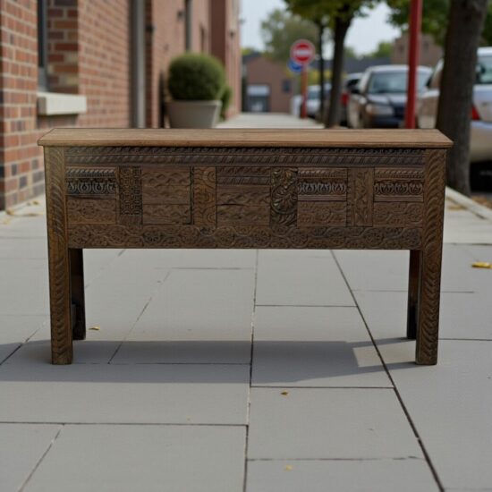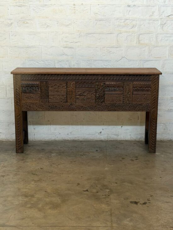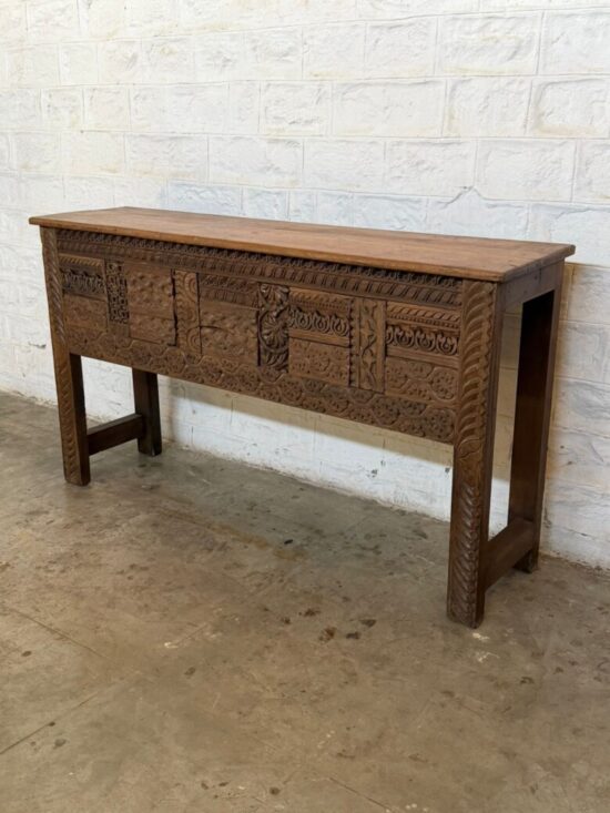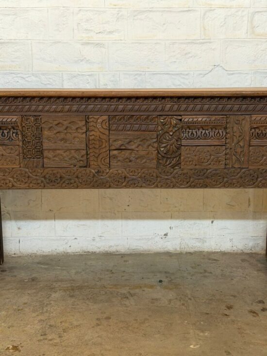 The long rectangular profile makes this piece ideal as an entryway console, sofa table, hallway statement piece, or behind-sofa accent. Its substantial teak construction, sculptural carving, and naturally aged patina give it the presence of true architectural furniture rather than decorative mass-produced décor.