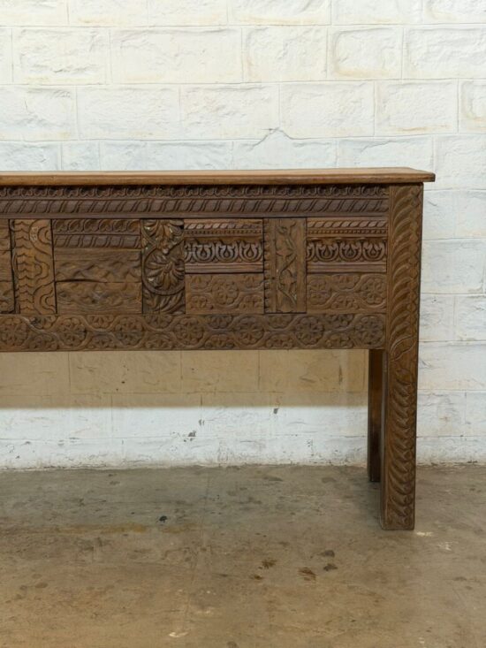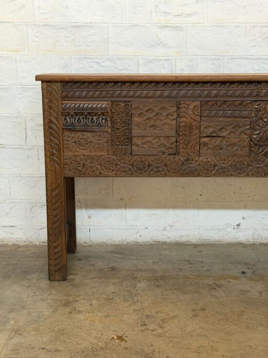 This exceptional antique Indian console table is handcrafted from solid teak wood and features richly detailed, deep hand-carved panels across the entire front. The carving showcases traditional Indian floral and architectural motifs, each section individually worked by skilled artisans decades ago.