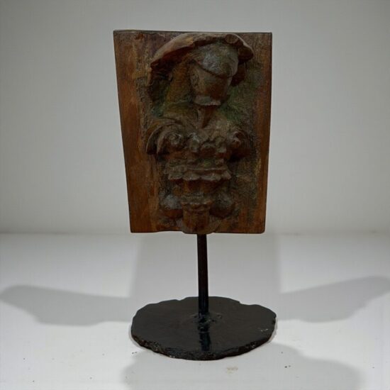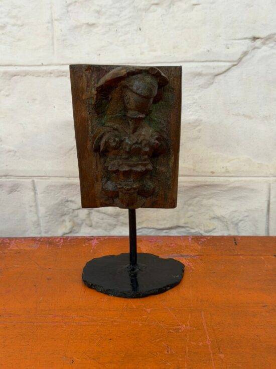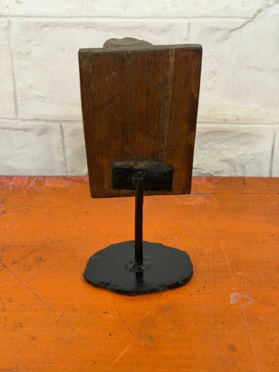 The carving showcases beautiful peacock motif, meticulously hand-carved with remarkable precision. The detailed craftsmanship reflects the artistry of skilled artisans from the past, making it a true collector’s piece. The natural aging process has given the wood a rich, dark patina, adding depth and authenticity to its appearance. Mounted on a sturdy metal stand, this piece is ideal as a decorative accent for bookshelves, desks, or console tables.