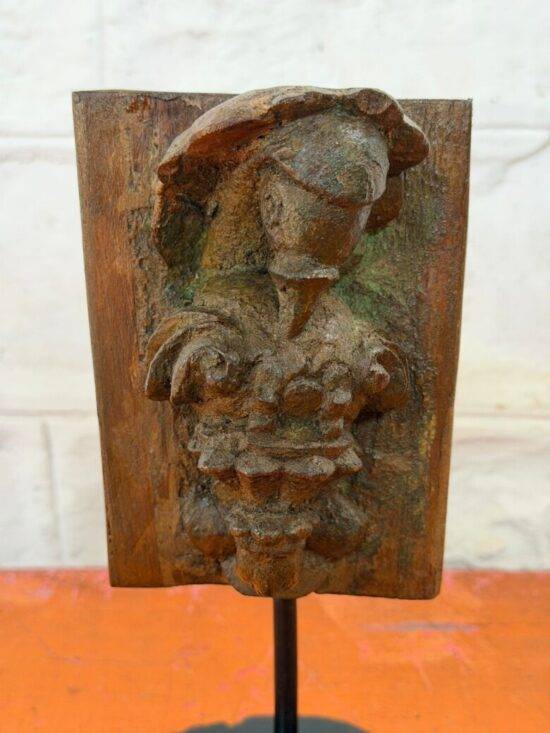 This stunning Antique Wooden Bracket Carving on Stand is a remarkable piece of architectural heritage, approximately 70-80 years old, crafted from solid teak wood. Originating from traditional Indian architecture, this bracket was once part of an intricately carved structure, possibly a temple, doorway, or wooden beam support.