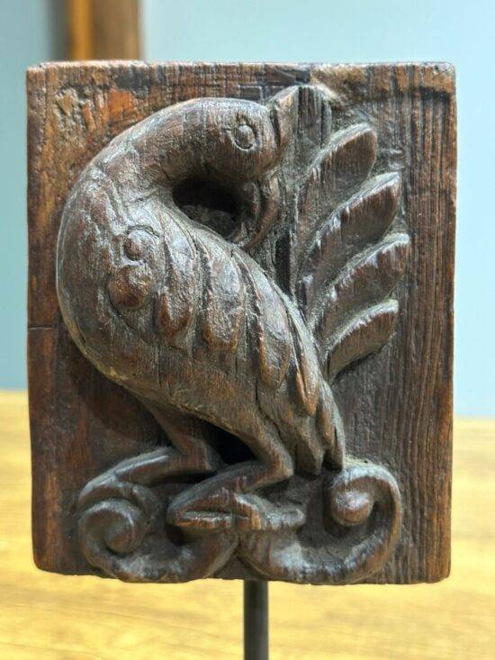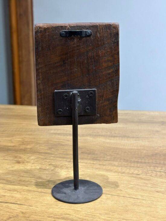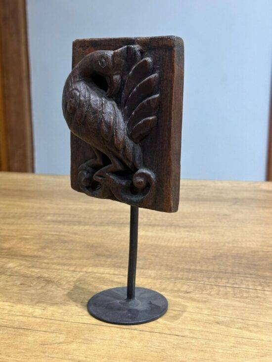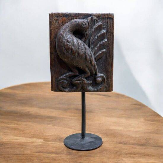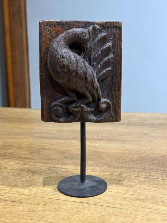The carving showcases beautiful peacock motif, meticulously hand-carved with remarkable precision. The detailed craftsmanship reflects the artistry of skilled artisans from the past, making it a true collector’s piece. The natural aging process has given the wood a rich, dark patina, adding depth and authenticity to its appearance. Mounted on a sturdy metal stand, this piece is ideal as a decorative accent for bookshelves, desks, or console tables.
