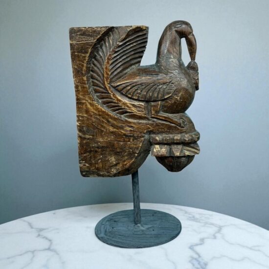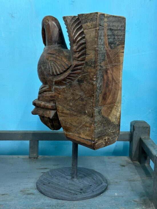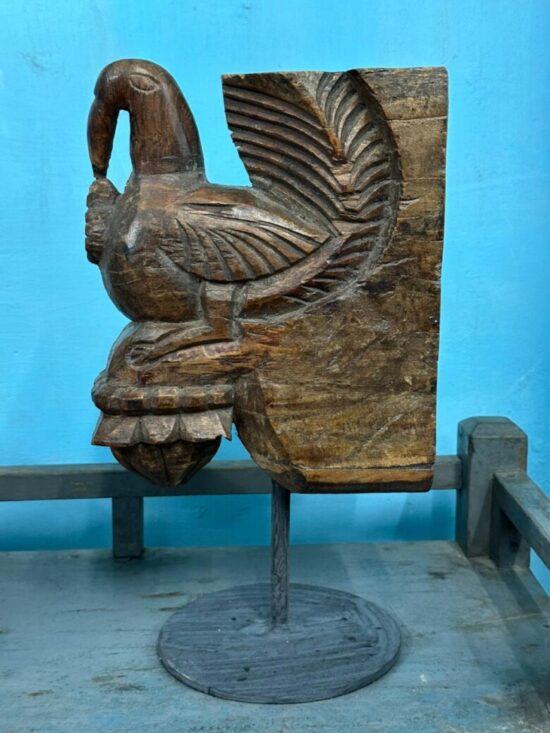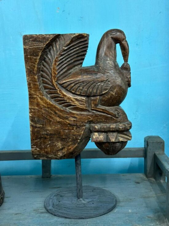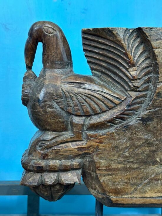 The carving showcases beautiful peacock motif, meticulously hand-carved with remarkable precision. The detailed craftsmanship reflects the artistry of skilled artisans from the past, making it a true collector’s piece. The natural aging process has given the wood a rich, dark patina, adding depth and authenticity to its appearance. Mounted on a sturdy metal stand, this piece is ideal as a decorative accent for bookshelves, desks, or console tables.