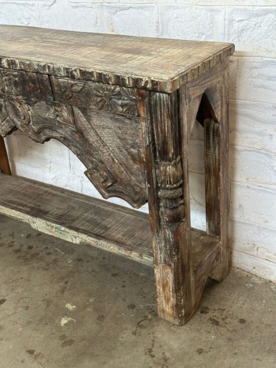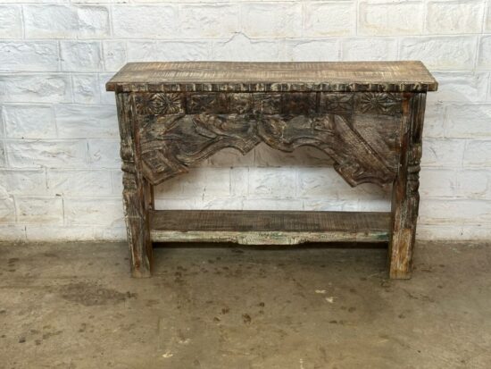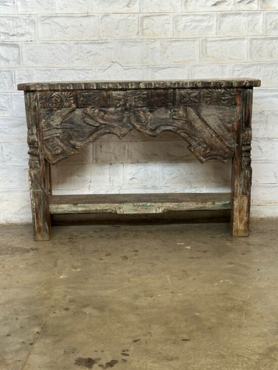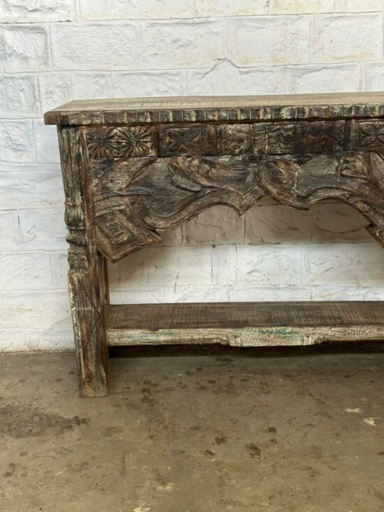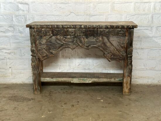 Crafted by skilled artisans, this console is not only a functional piece but also a statement of heritage and culture. Its versatile design makes it perfect as an entryway console, living room display, hallway table, or vanity base. The natural patina and hand-carved details enhance its authentic vintage appeal, making it an excellent choice for collectors and interior stylists.