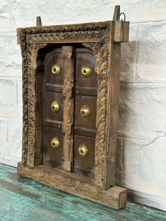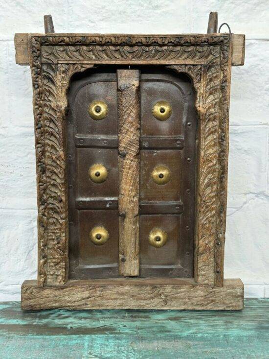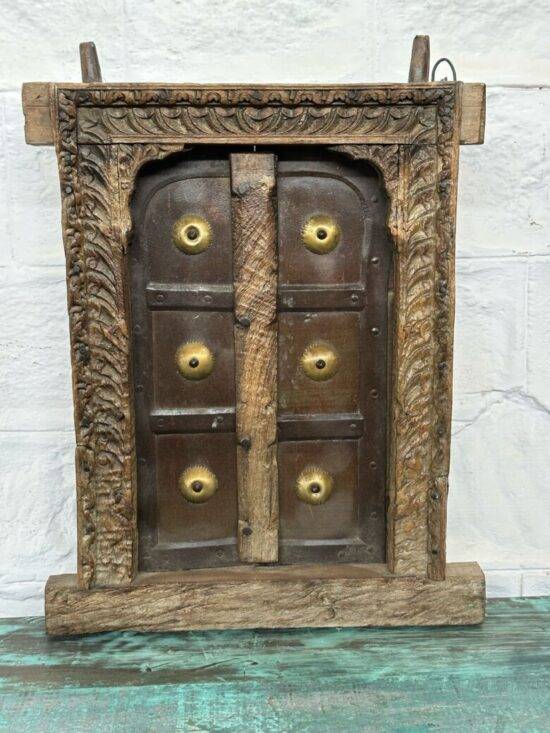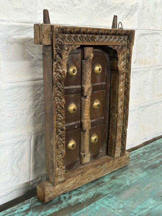 Each piece is intricately carved by skilled artisans, with a frame that showcases traditional Indian motifs and textured patterns that have weathered over time to create a stunning natural patina. The window doors are adorned with eight brass medallions, reminiscent of ancient temple or haveli doors, and the solid central wooden bar evokes a sense of strength and tradition.