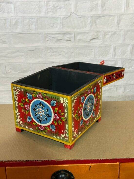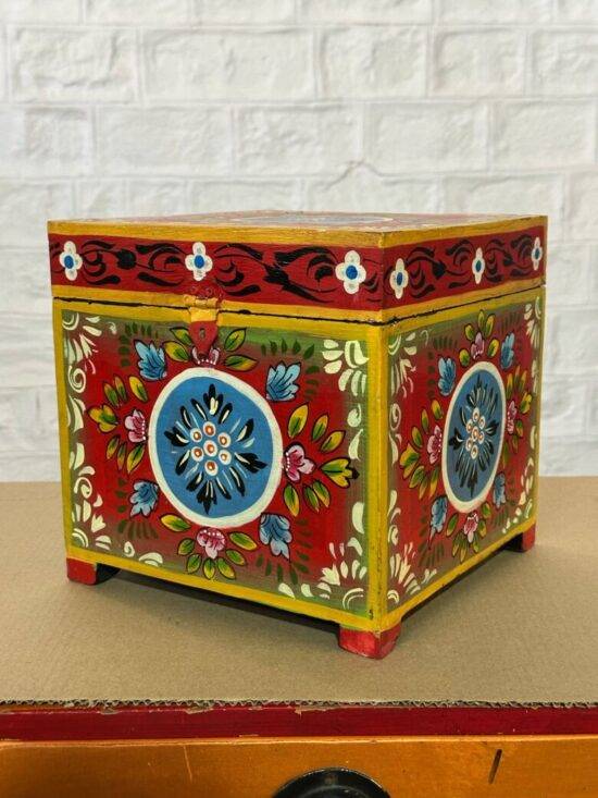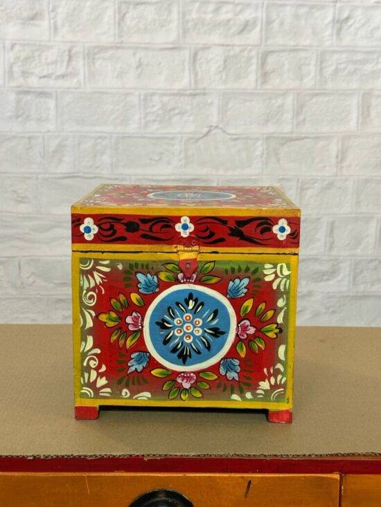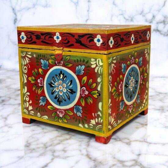 Add a touch of vibrant artistry to your space with the Devrath Hand Painted Box. Crafted from solid wood, this beautiful box is meticulously hand-painted by skilled artisans, showcasing a delightful mix of floral and traditional motifs.