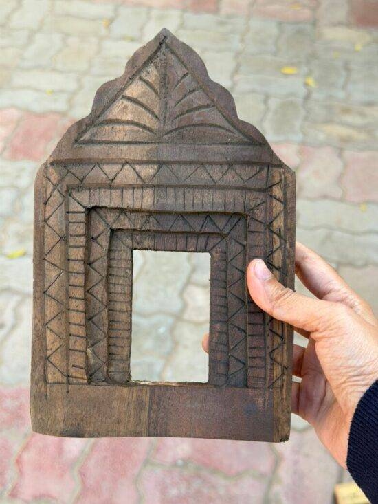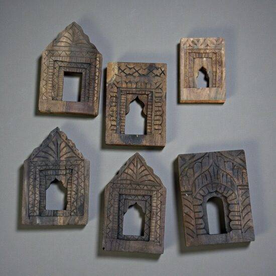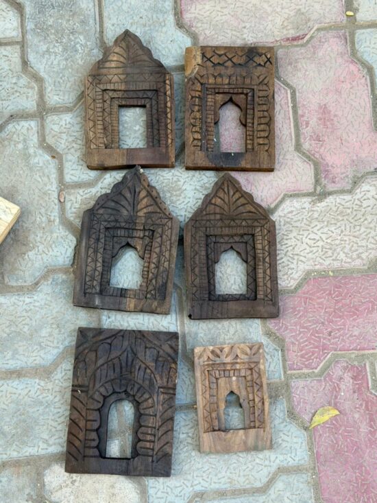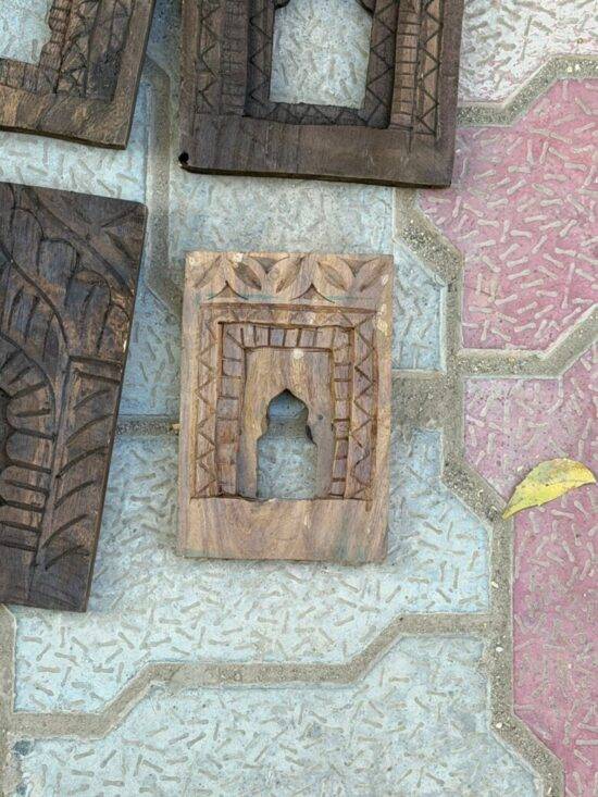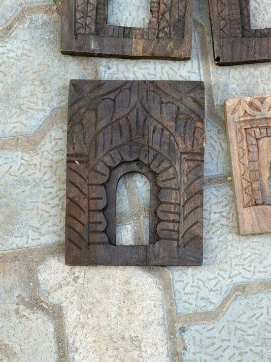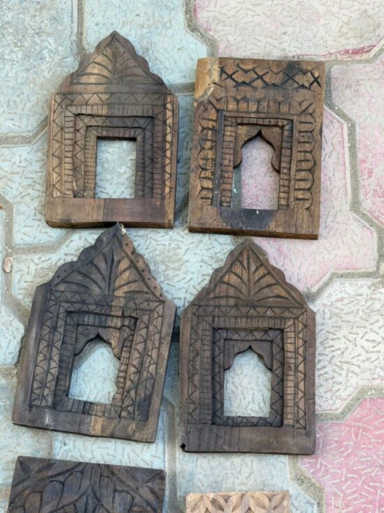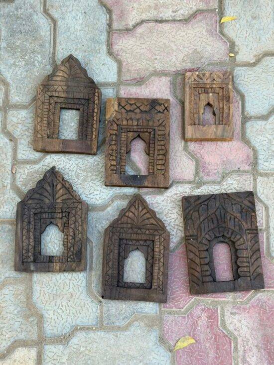 Each frame features traditional Indian motifs—arched niches, temple-style forms, and geometric carving—making them perfect for gallery walls, boho interiors, rustic farmhouse homes, or designer projects.