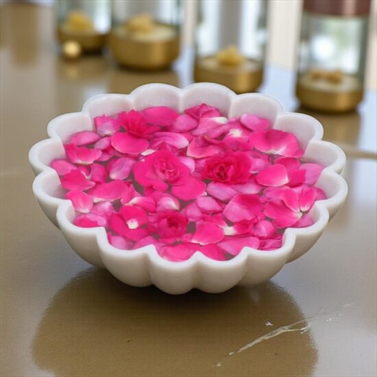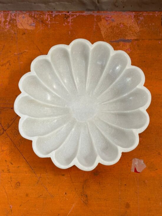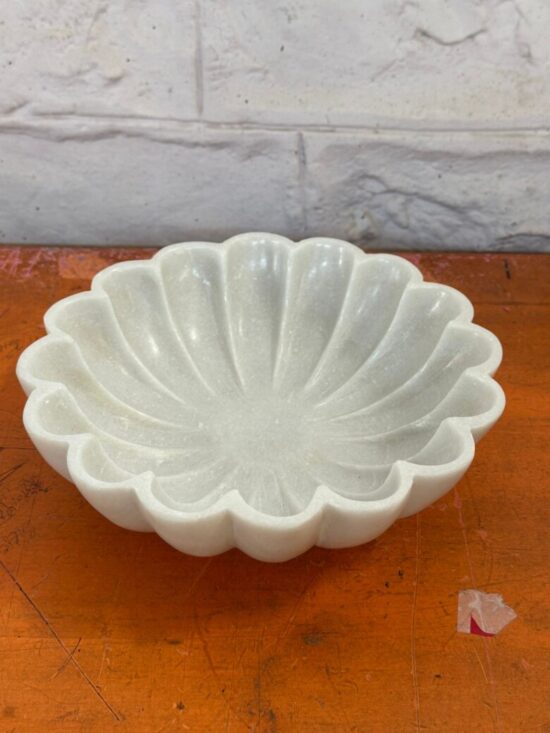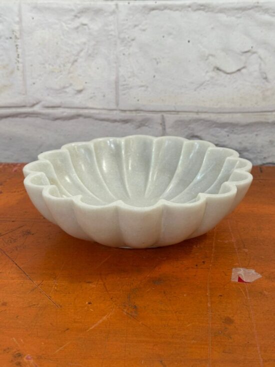 This stunning 9 x 9 x 2.5 inch uruli is carved from solid marble and petal-like edges. Its smooth white finish adds elegance, making it perfect for both modern and traditional interiors.