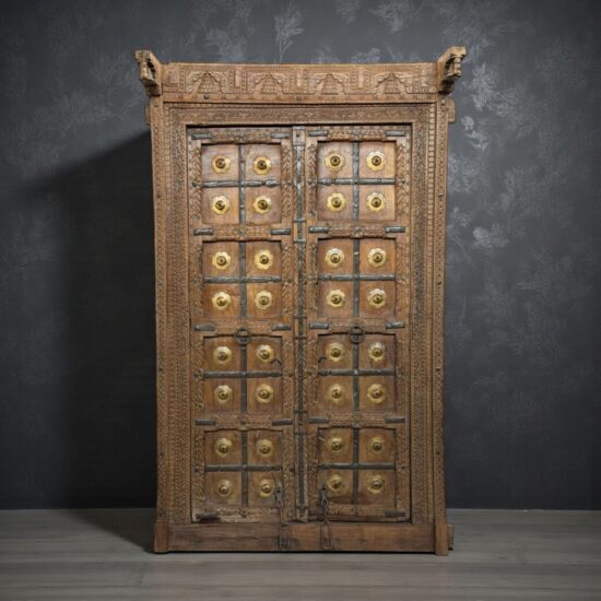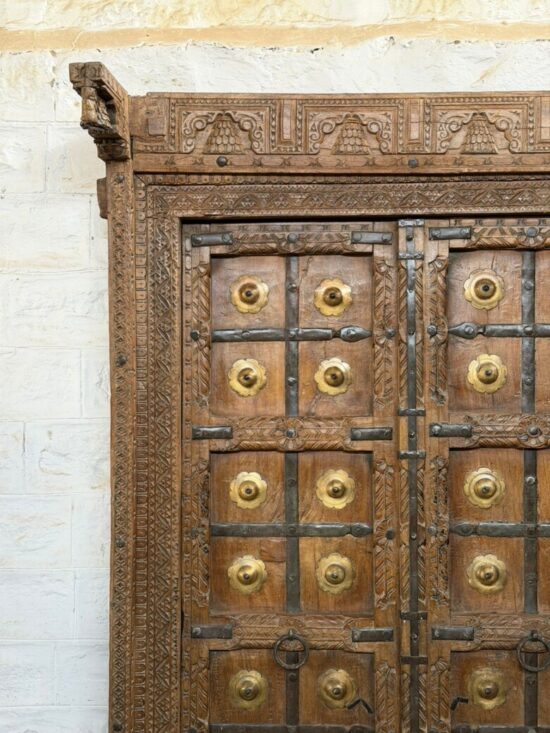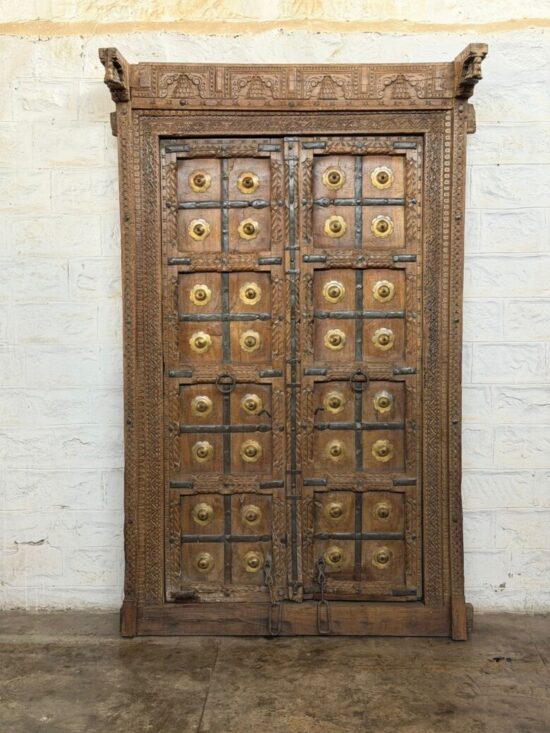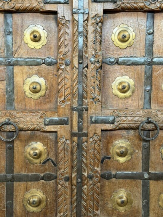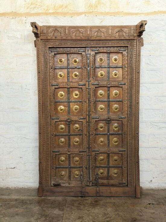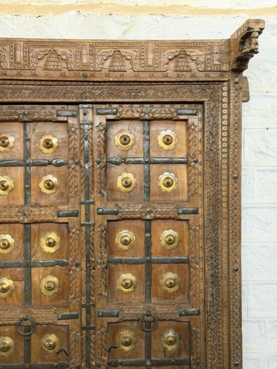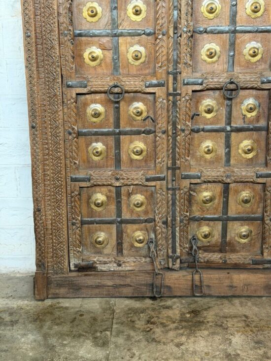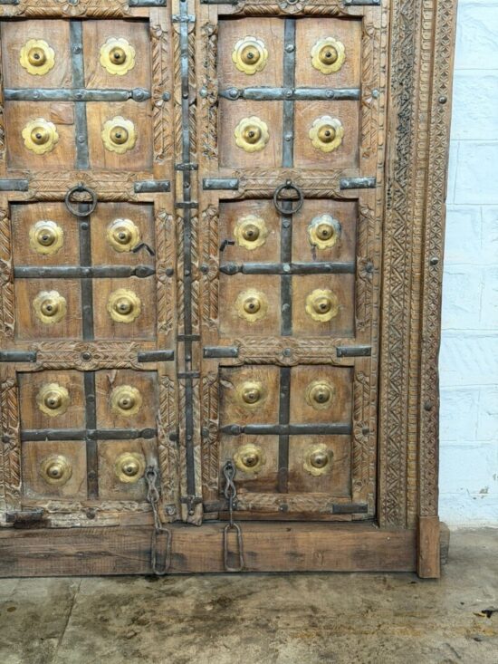 An exceptional 90-year-old antique double door crafted from solid teak wood and adorned with original hand-fitted brass studs and iron hardware. This architectural masterpiece comes from traditional Indian haveli craftsmanship, showcasing remarkable hand carving across the frame, panels, and lintel.