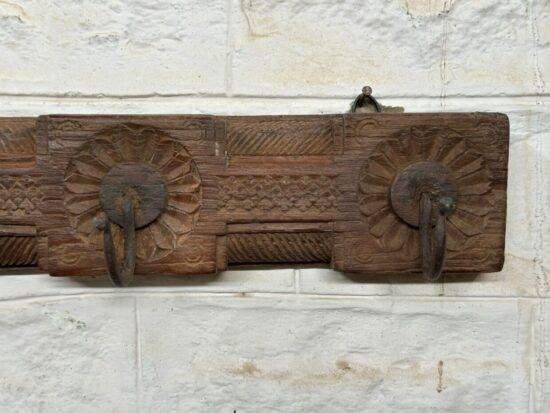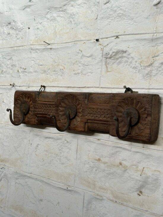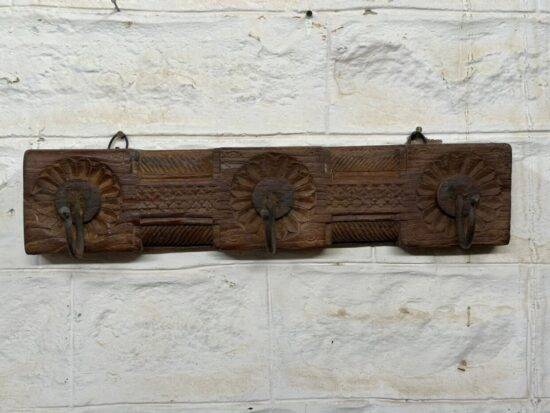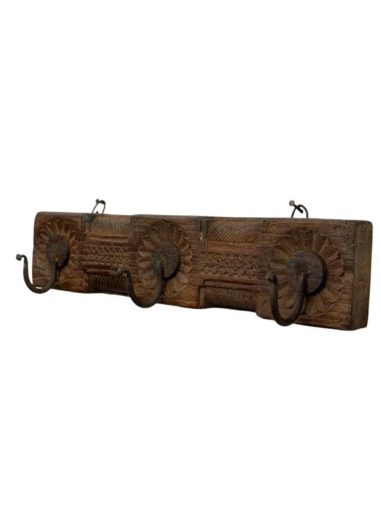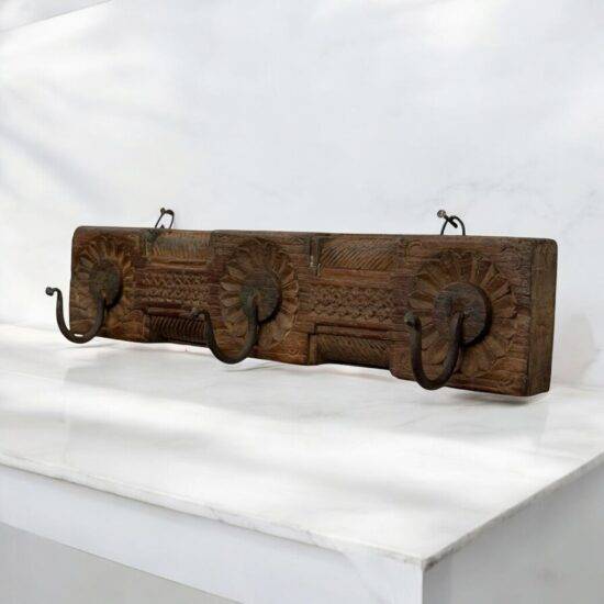 Add a touch of rustic elegance to your home with this antique wooden wall hook panel, hand-carved from solid teak and adorned with three iron hooks. This piece features sunburst floral carvings and geometric patterns, reflecting the intricate craftsmanship of traditional Indian artisans.