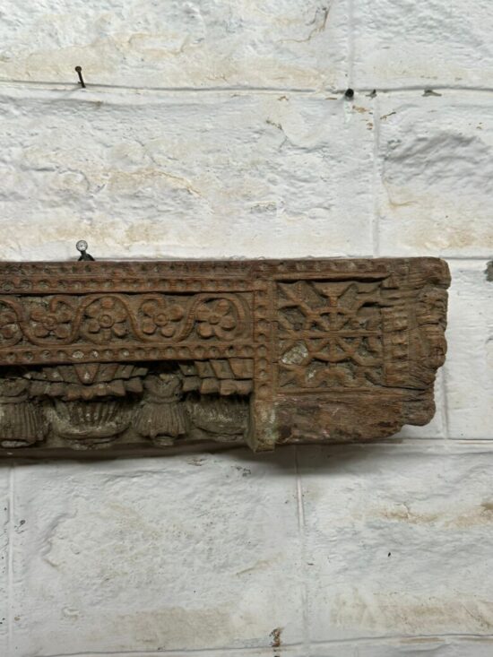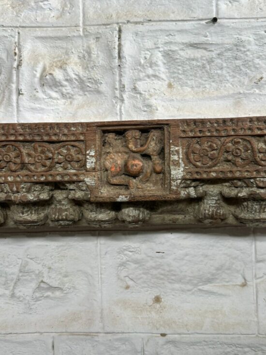 Infuse your space with sacred symbolism and historic craftsmanship through this exceptional antique Indian temple wall panel. Hand-carved from solid wood and dating back to the early 1900s, this architectural relic once graced the threshold of a traditional Hindu temple.