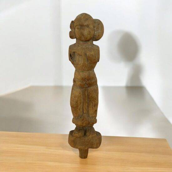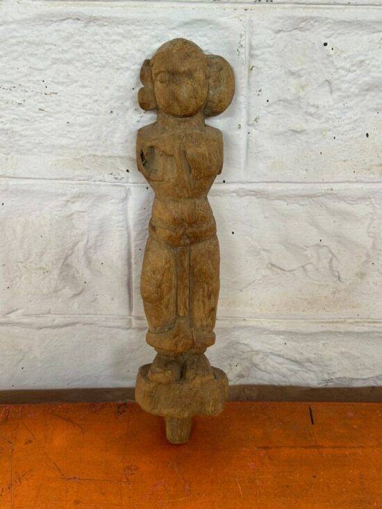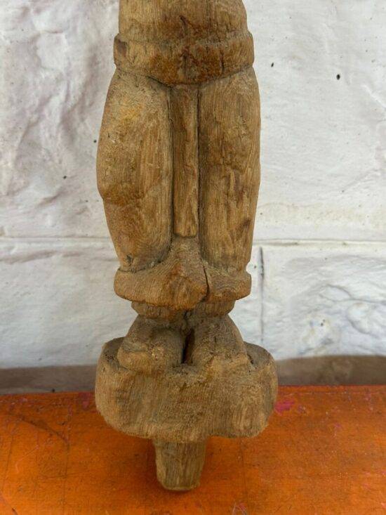 Bring home a piece of heritage with this antique hand-carved wooden tribal figure, sourced from rural India and believed to be part of a traditional architectural structure. Measuring approximately 14 inches tall, this figure features a simplistic yet expressive human form, embodying the raw artistry of indigenous woodcraft.