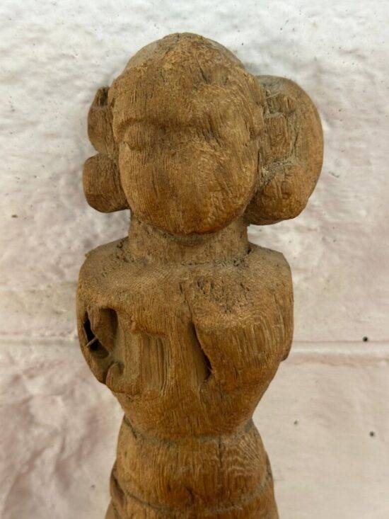 Hand-carved from a single piece of aged hardwood, the sculpture carries natural wear, patina, and timeworn character—evidence of its authentic vintage origin. Originally used as a bracket or decorative column end, this piece now makes for a stunning rustic decor object, shelf accent, or wall-mounted spiritual artifact.