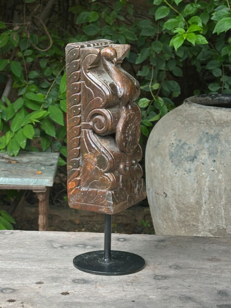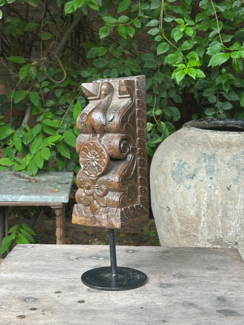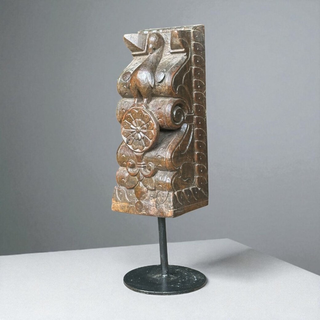 Bring centuries of Indian temple art into your home with this authentic antique wooden temple fragment, dating back to the 18th–19th century. Hand-carved from solid hardwood, this piece showcases exquisite traditional motifs including a sculpted bird, floral rosettes, and scrollwork, all rich in symbolism and spiritual meaning.