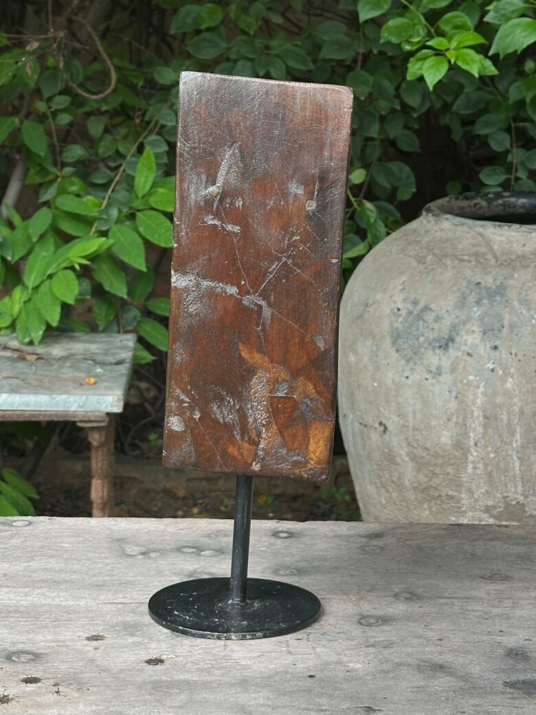Once part of a grand temple structure, this fragment has been thoughtfully mounted on a modern iron stand, turning it into a stunning display sculpture ideal for shelves, mantels, entryways, or gallery walls.