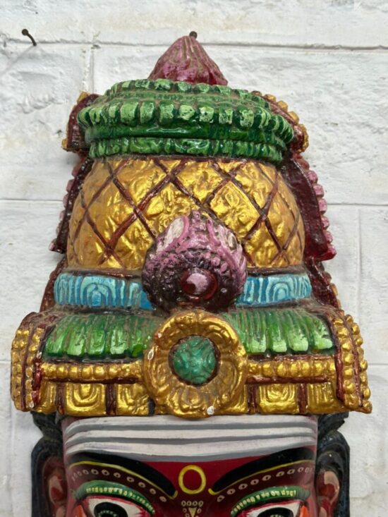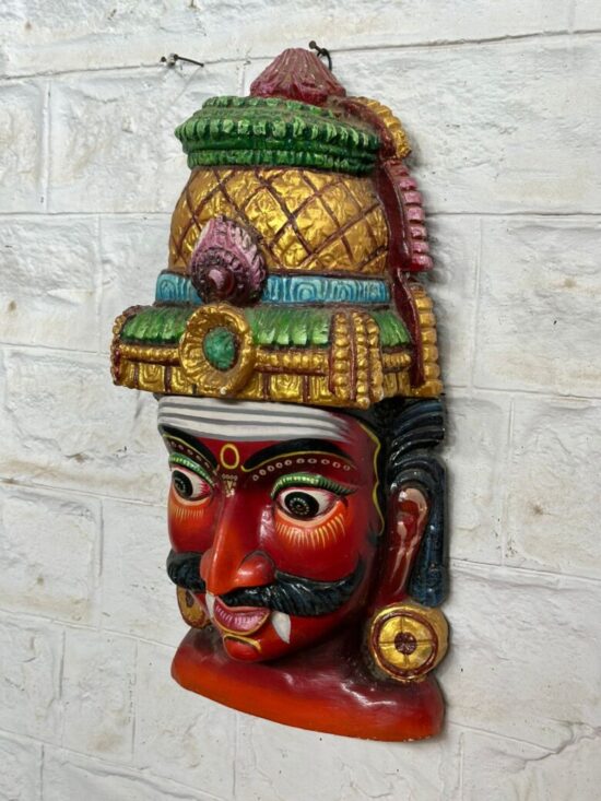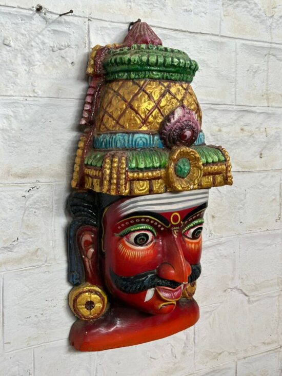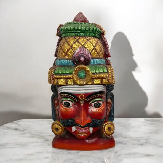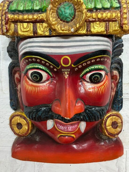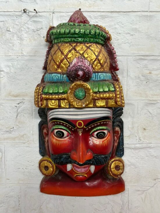 Make a bold statement in your home with this vibrant hand-painted wooden head mask, inspired by traditional South Indian folk art. Crafted from solid wood and richly painted in striking reds, greens, and golds, this piece represents a fierce guardian figure often used in cultural rituals and festive performances to ward off evil.