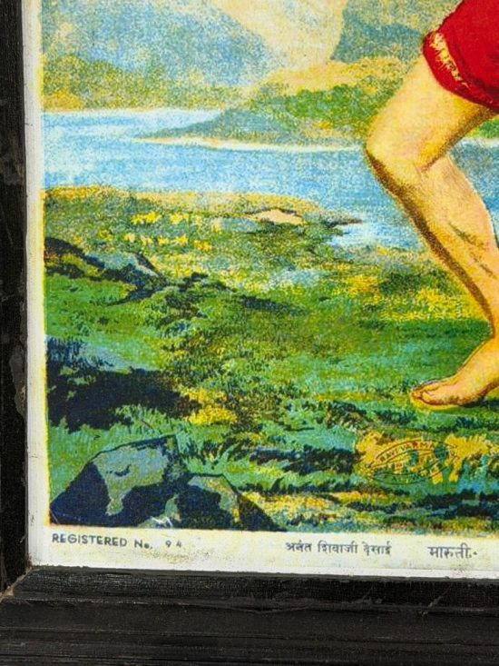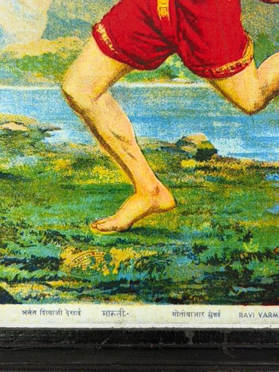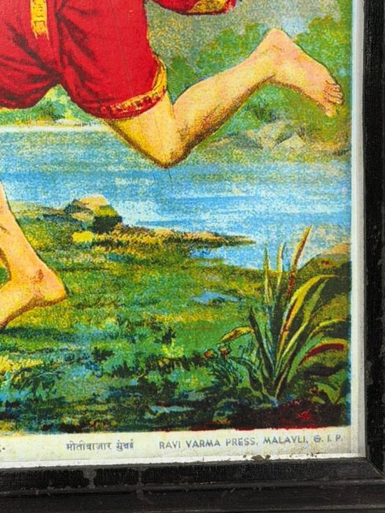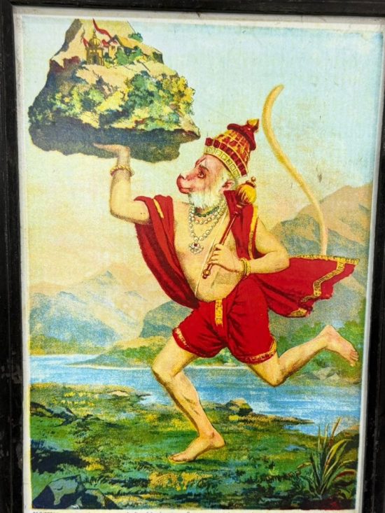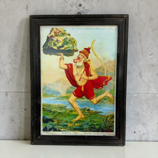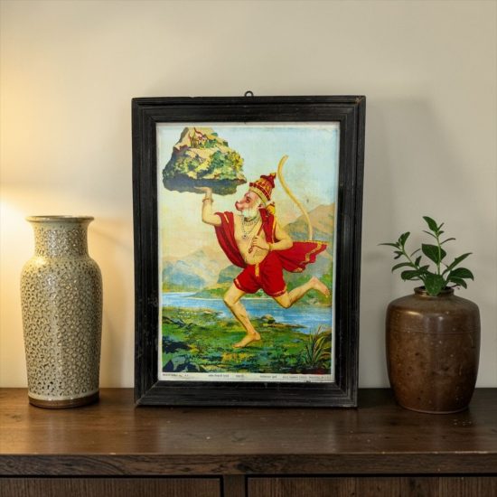 A beautiful Hanuman artwork presented in a vintage-style teak wood frame, combining traditional Indian spirituality with timeless décor aesthetics.