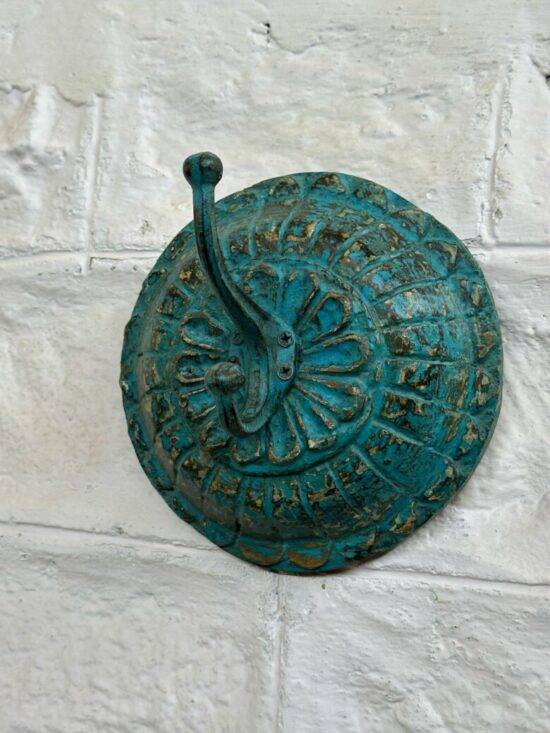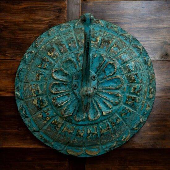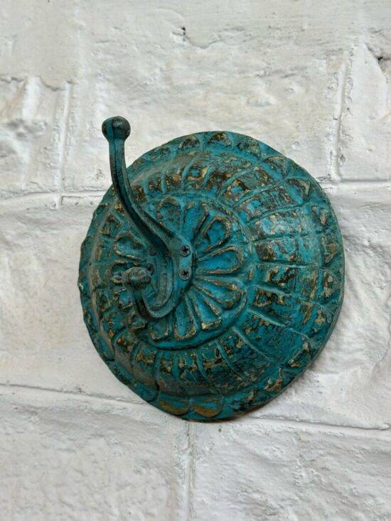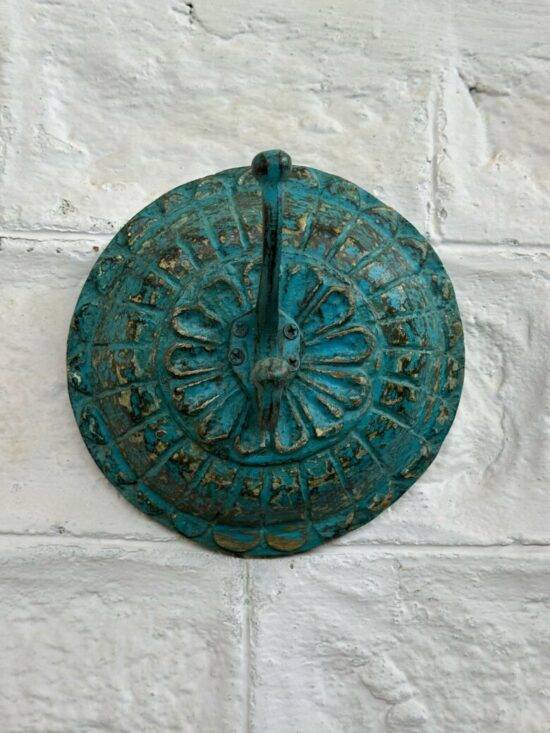 Add a touch of vintage elegance and old-world charm to your space with the Indira Antique Turquoise Wall Hook. This handcrafted piece, measuring 8 x 8 x 5 inches, is carved from solid wood and features a weathered turquoise patina that reveals traces of its original wood beneath. The circular floral design on the base radiates outward like sunbeams or lotus petals, while the central hook stands strong—both ornamental and practical.