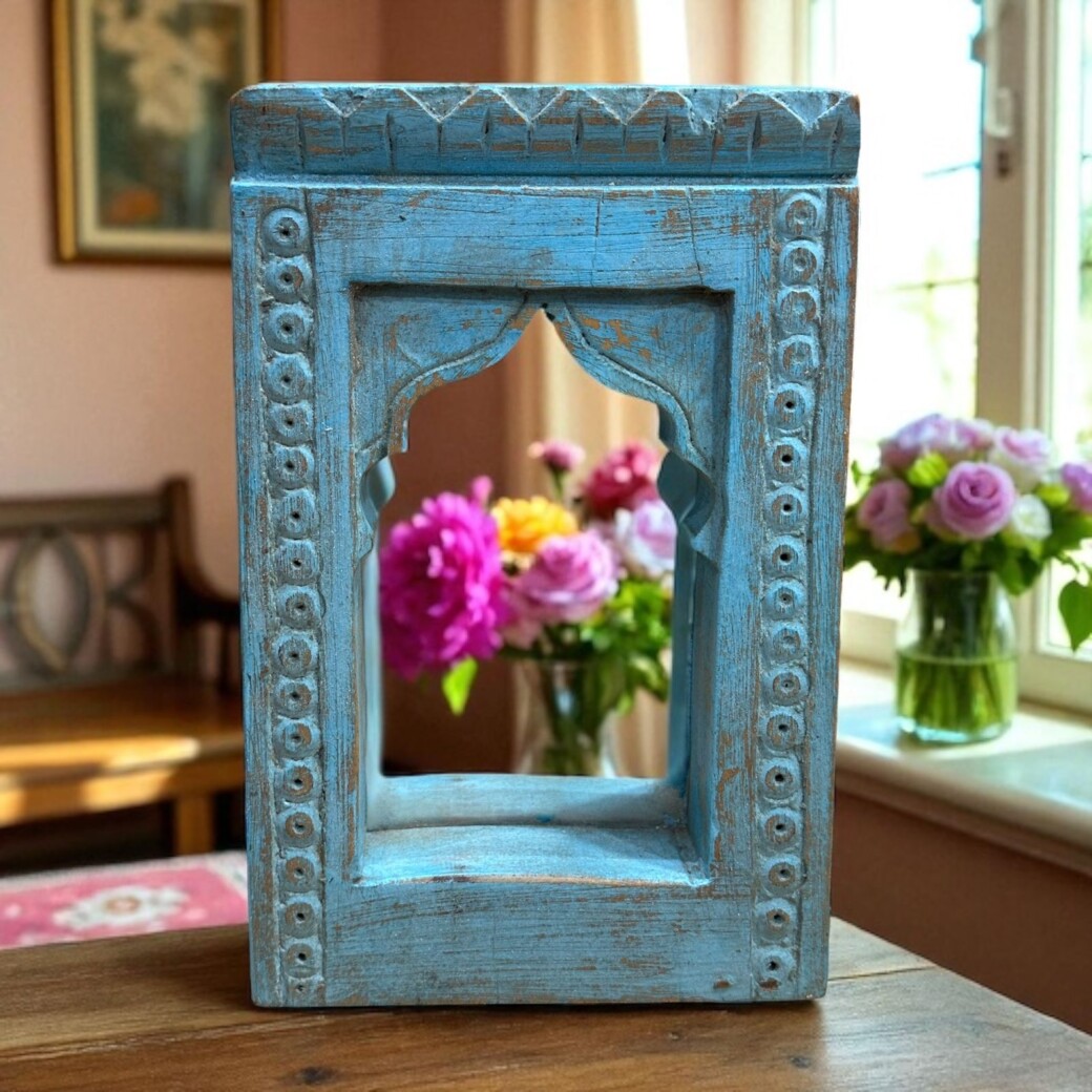 Crafted in a classic jharokha (arched window) style, this Antique Temple Mirror features intricate hand-carved details and a rich, distressed purple finish. The piece captures the spiritual and architectural elegance of old Indian temples.